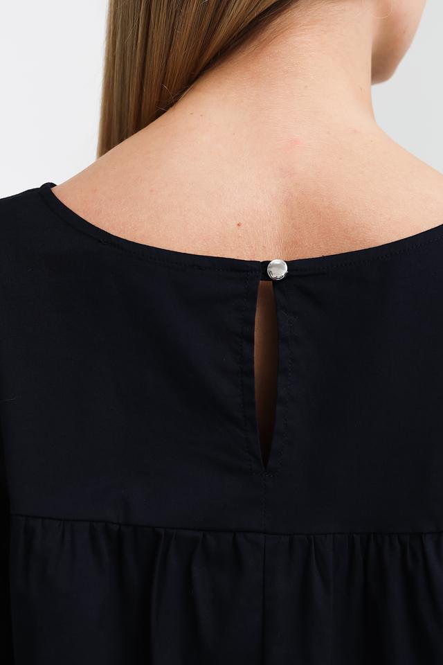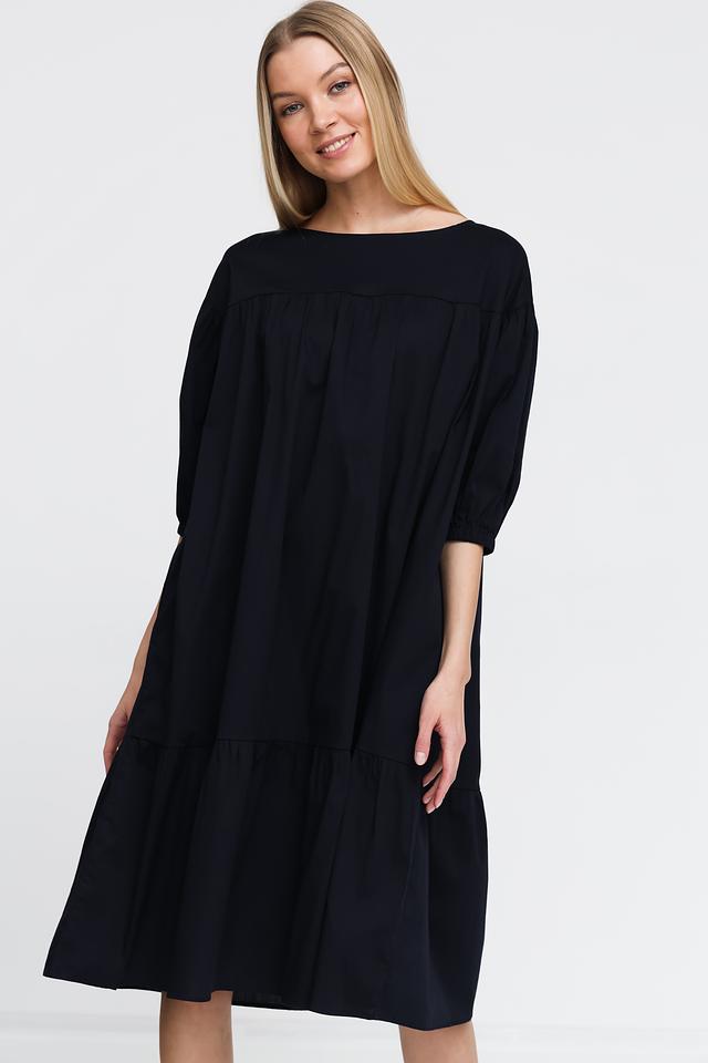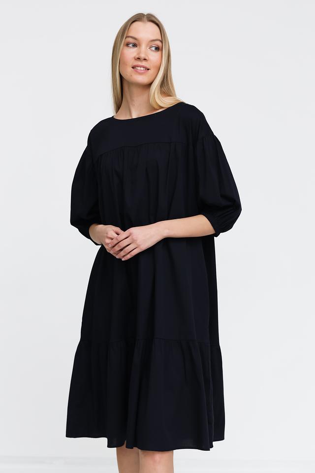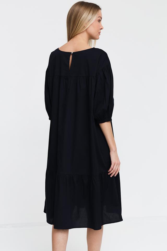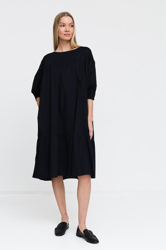 Чёрное платье от Pezzo свободного кроя с рукавами 3/4 и многослойной юбкой. Изготовлено из хлопка с добавлением эластана для комфорта и удобства. Идеальный выбор для создания повседневного образа. Состав: хлопок 95%, эластан 5%