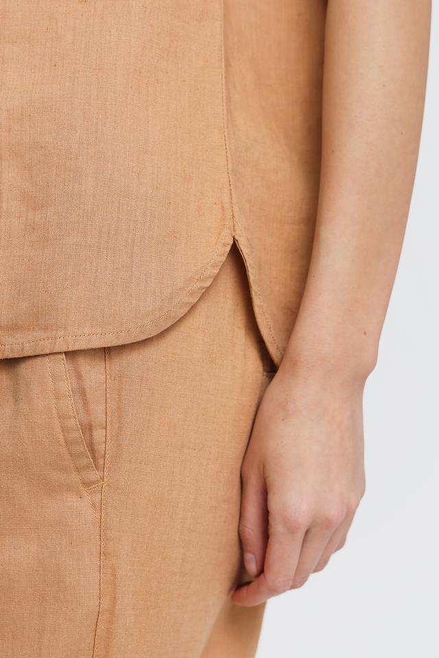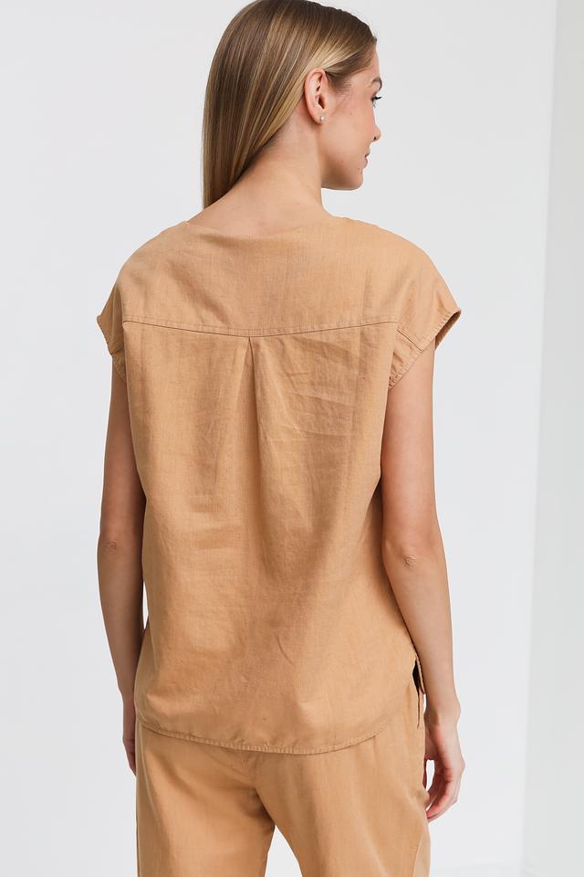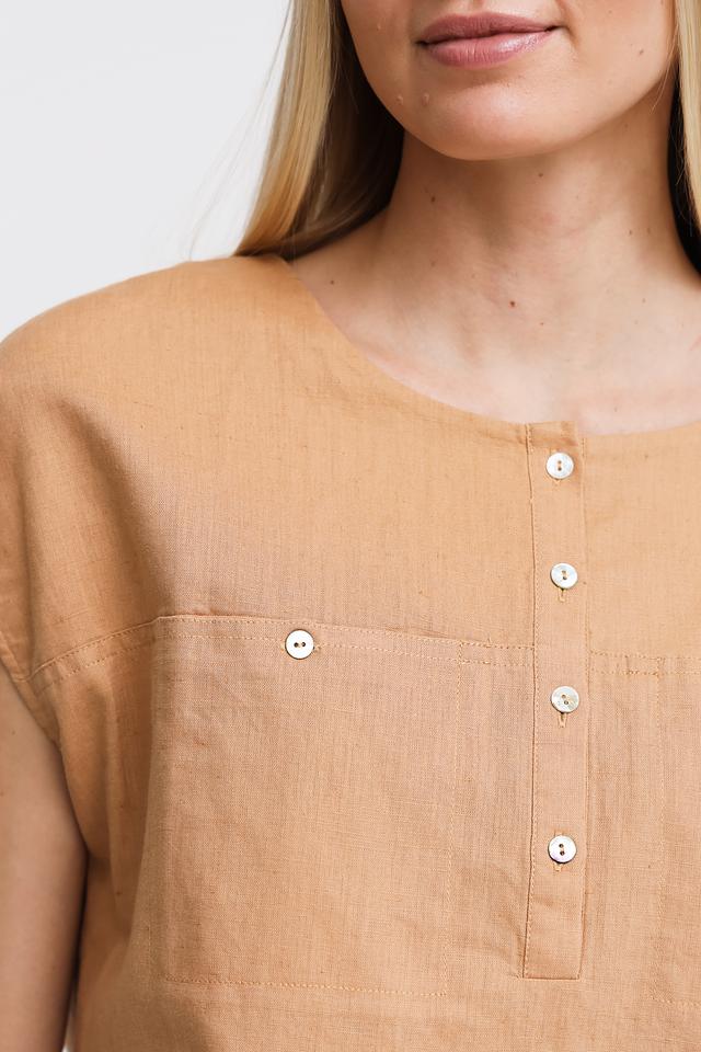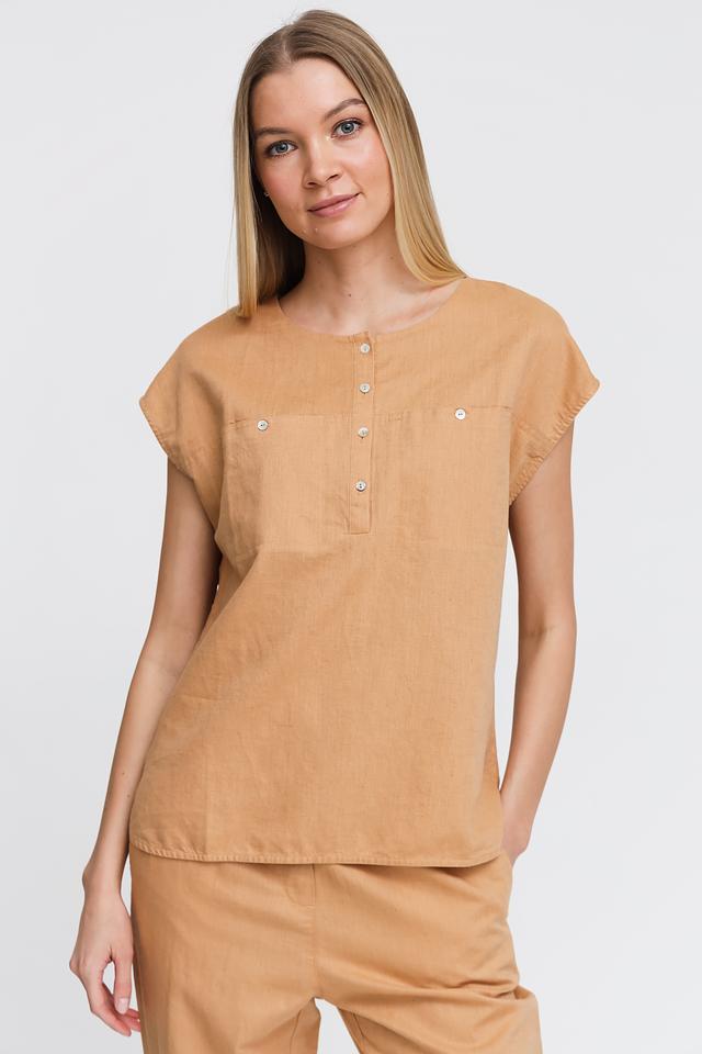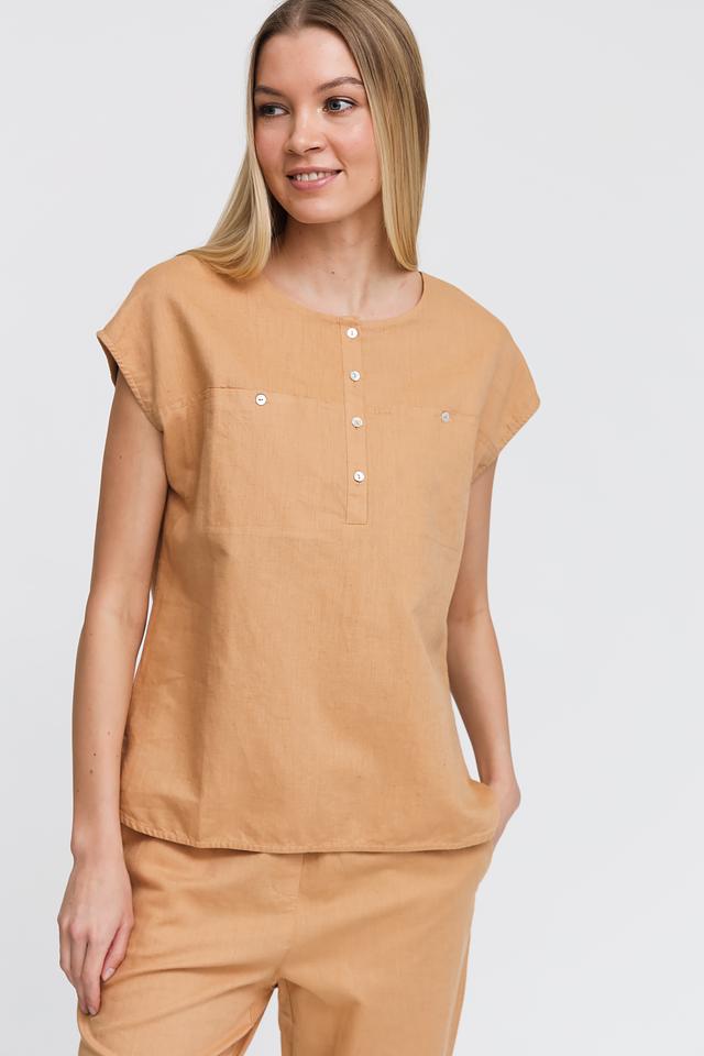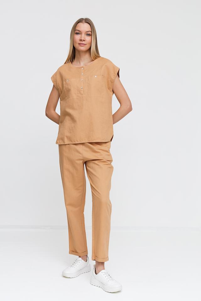 Бежевая блуза Pezzo с короткими рукавами-воланами и округлым вырезом. Изготовлена из натурального смесового льна и хлопка, что обеспечивает комфорт и воздухопроницаемость. Отличный выбор для создания легкого и стильного образа. Состав: лен 55%, хлопок 45%
