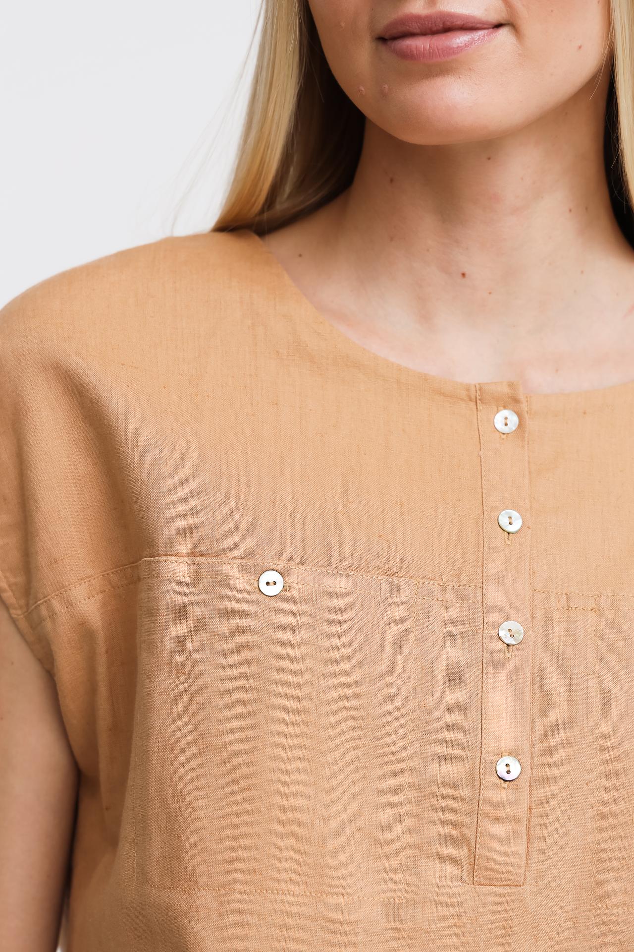 Лёгкая и удобная блуза из натуральных материалов – идеальный выбор для комфортного летнего образа. Блуза выполнена из смесовой ткани (45% хлопок, 55% лен), что обеспечивает отличную воздухопроницаемость и приятные ощущения на коже. Прямой крой и лаконичный дизайн делают эту блузу универсальной для создания различных стилей.