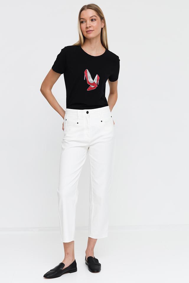 Джинсы имеют укороченный крой, что делает их идеальным выбором для теплого времени года. Прямой крой обеспечивает комфортную посадку по фигуре, не сковывая движений. Классическая застежка на пуговицу и молнию, а также пять карманов — два спереди и два сзади — добавляют функциональности.