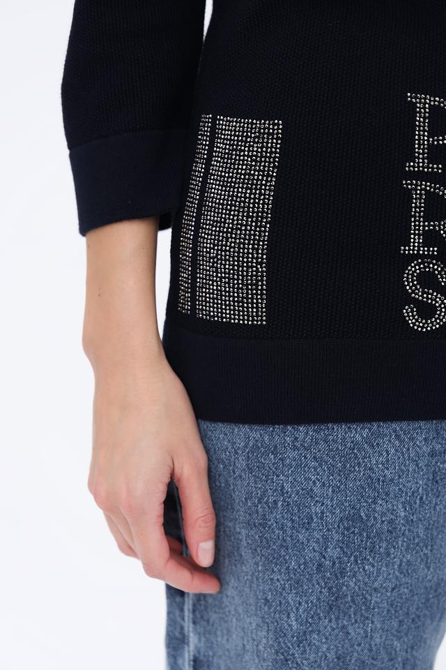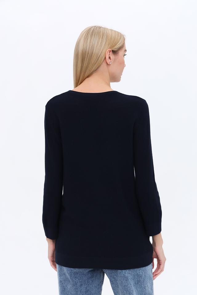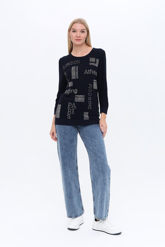 Пуловер имеет удобный прямой крой и ¾ рукава, что делает его универсальным для различных образов. Он прекрасно сочетается с джинсами, брюками или юбками, позволяя создавать как повседневные, так и более нарядные комплекты.