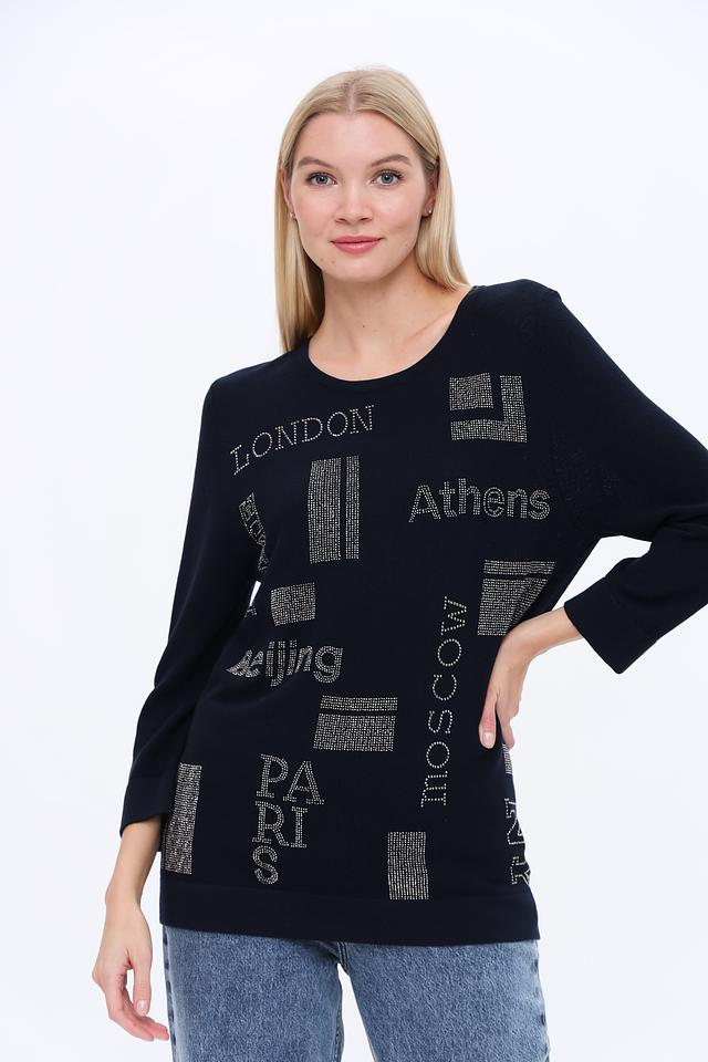 Этот стильный пуловер от Pezzo станет отличным дополнением к вашему гардеробу. Выполненный в классическом чёрном цвете, он украшен ярким принтом с названиями городов, выполненным с использованием страз, что придает ему особый шарм.