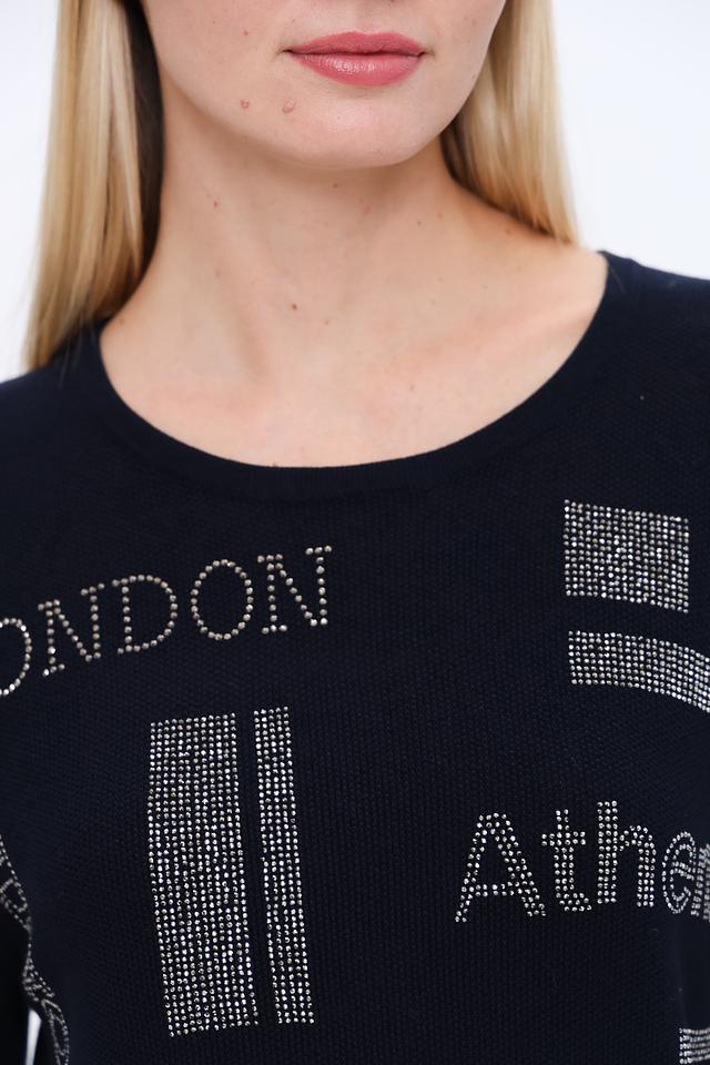 Чёрный пуловер Pezzo с оригинальным принтом в виде названий городов и декоративной отделкой стразами. Модель выполнена из мягкого и приятного к телу сочетания хлопка и акрила, обеспечивая комфорт в носке. Состав: хлопок 60%, акрил 40%