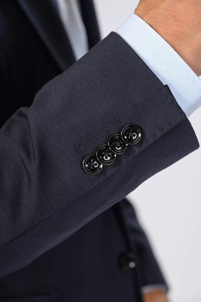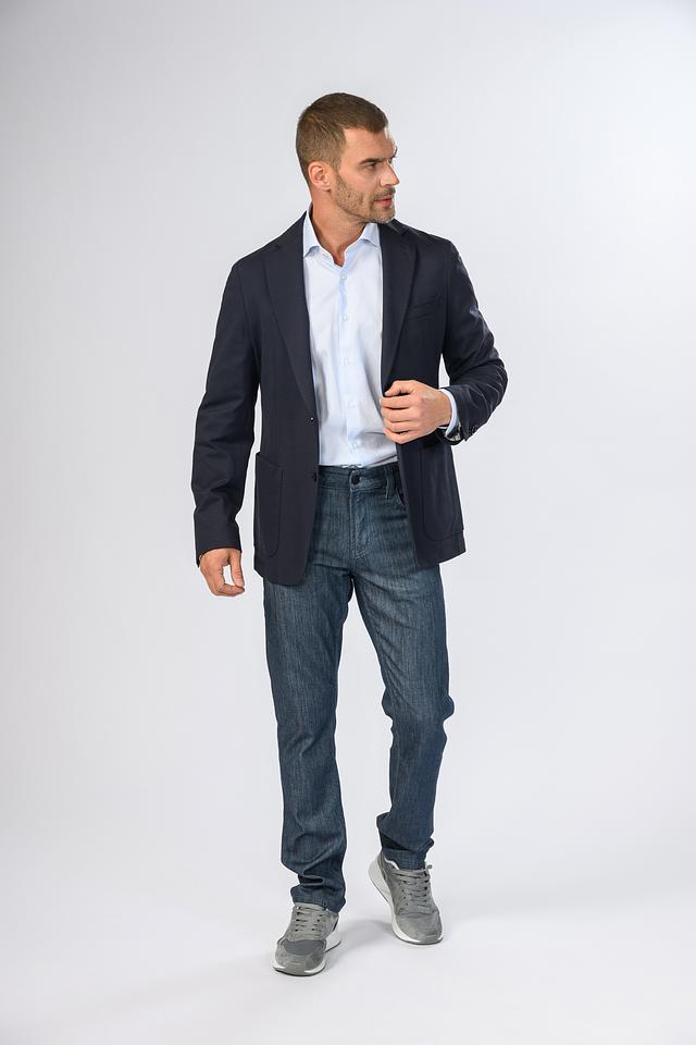 Пиджак имеет стандартный крой, лацканы классической формы и два прорезных кармана с клапанами. На левой стороне груди расположен нагрудный карман для платка. Подкладка обеспечивает дополнительный комфорт и удобство. Тёмно-синий цвет делает этот пиджак универсальным и подходящим для сочетания с различными брюками и рубашками.