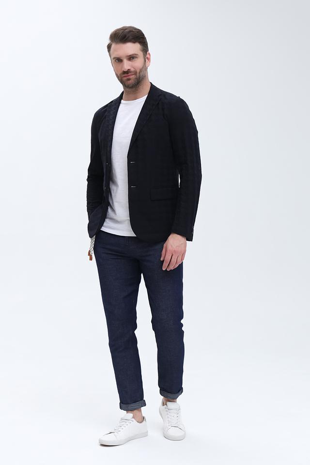 Пиджак имеет однобортную застёжку на две пуговицы, лацканы стандартной ширины и функциональные карманы с клапанами. Текстурированная ткань добавляет модели визуальный интерес и делает её более оригинальной.