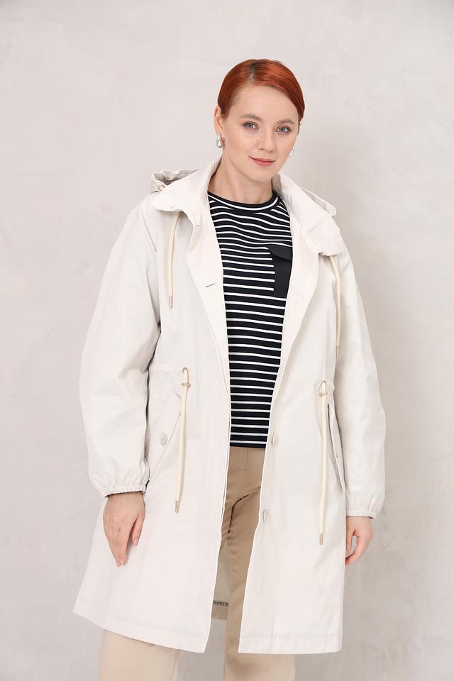 Плащ имеет удобный капюшон, который защитит от непогоды, а шнурки на талии позволяют регулировать силуэт и подчеркнуть фигуру. Застёжка на пуговицы обеспечивает надёжную фиксацию.