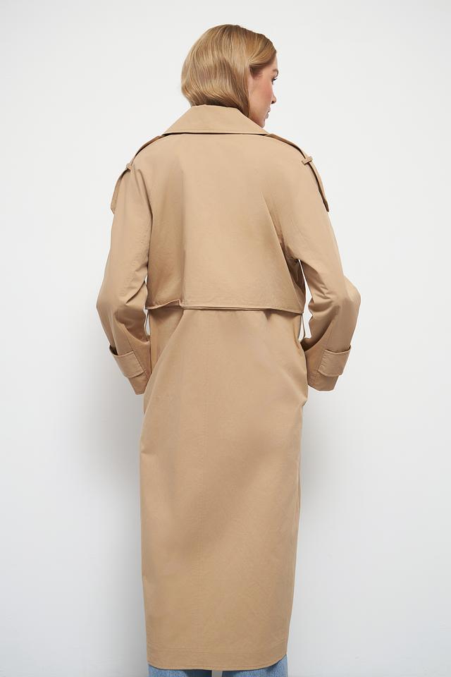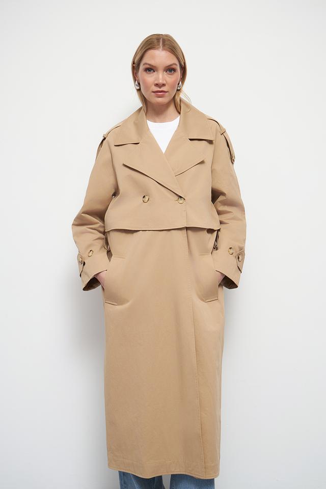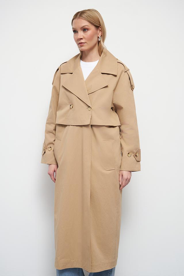 Классический тренчкот отличается прямым кроем, который подходит для любой фигуры. Двубортная застёжка с пуговицами добавляет образу строгости и изысканности. Широкий отложной воротник и погоны на плечах подчеркивают стиль и внимание к деталям.