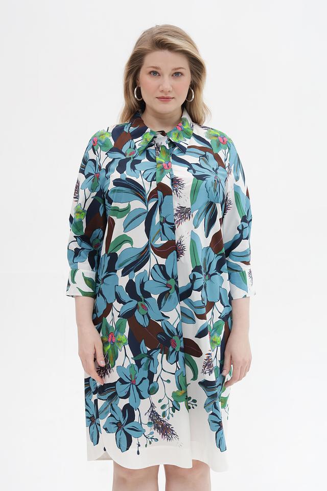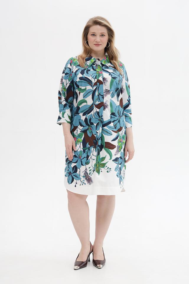 Платье имеет прямой, слегка приталенный силуэт, который подчеркнет достоинства фигуры. Рукава длиной 3/4 и классический воротник рубашка придают модели элегантный и женственный вид. Изделие выполнено из 100% хлопка – натурального, приятного к телу материала, который обеспечивает комфорт в течение всего дня.