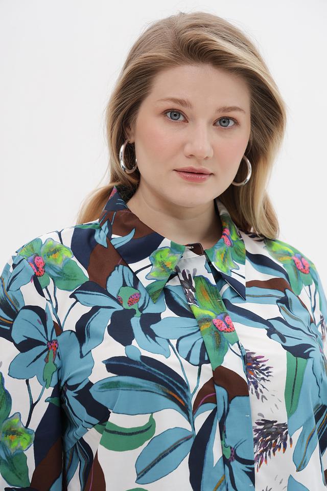 Платье рубашка от бренда Luisa Cerano станет стильным дополнением вашего гардероба. Модель выполнена в белом цвете и украшена ярким цветочным принтом, сочетающим в себе оттенки голубого, коричневого и зелёного.