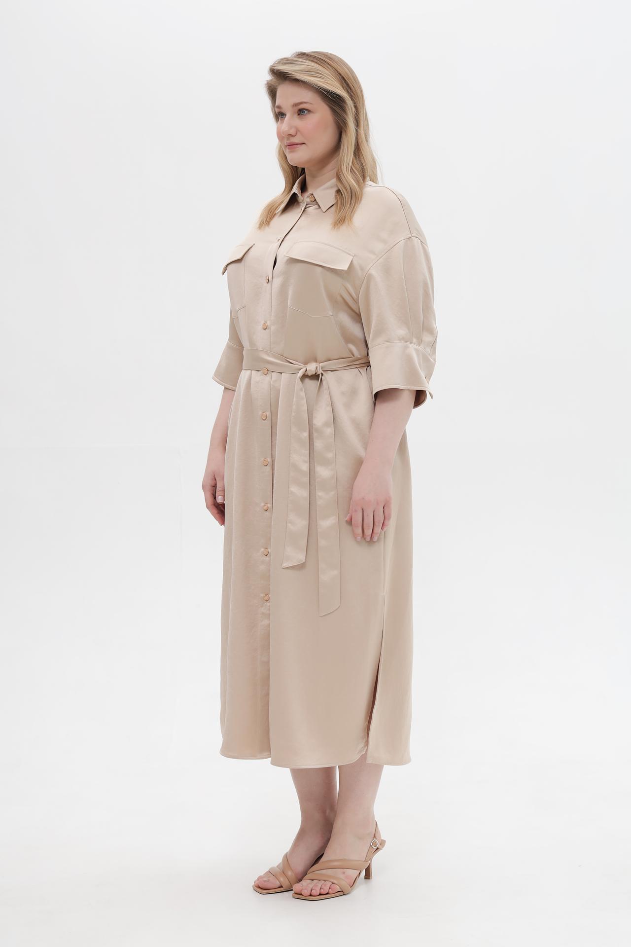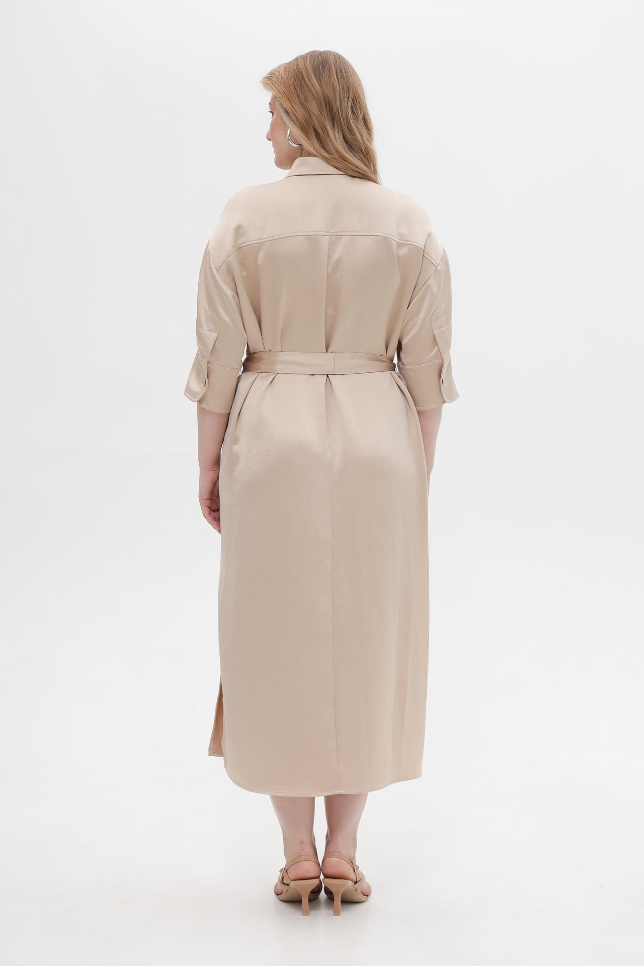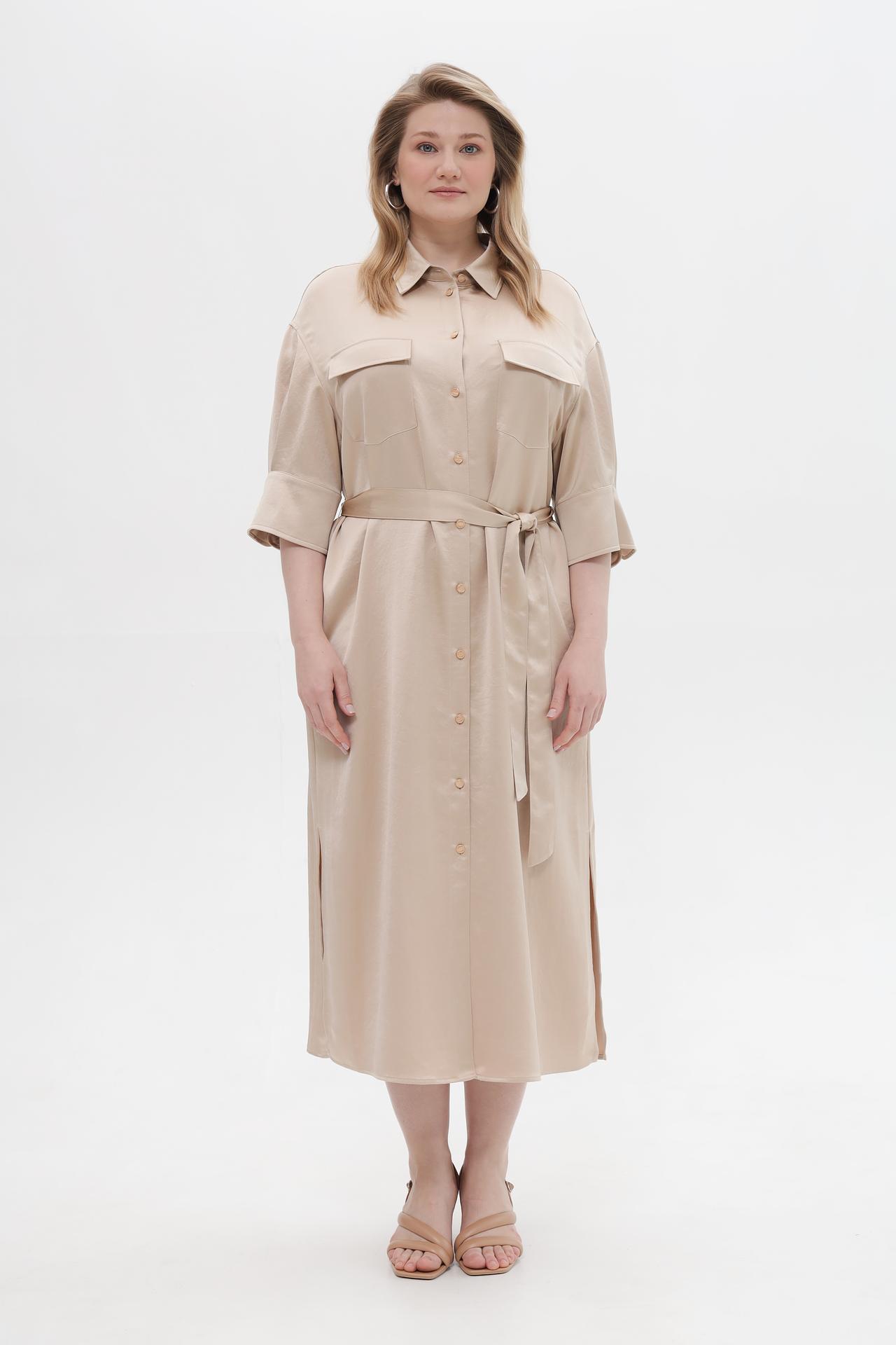 - Фасон: Платье-рубашка с поясом акцентирует достоинства фигуры и создает элегантный образ.