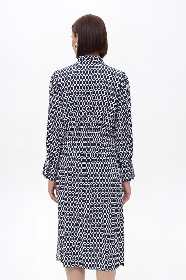 Платье Olsen синего цвета с геометрическим принтом – стильное и комфортное решение для повседневного образа. Модель выполнена из 100% вискозы, имеет воротник-стойку и завязывающийся пояс. Состав: вискоза 100%