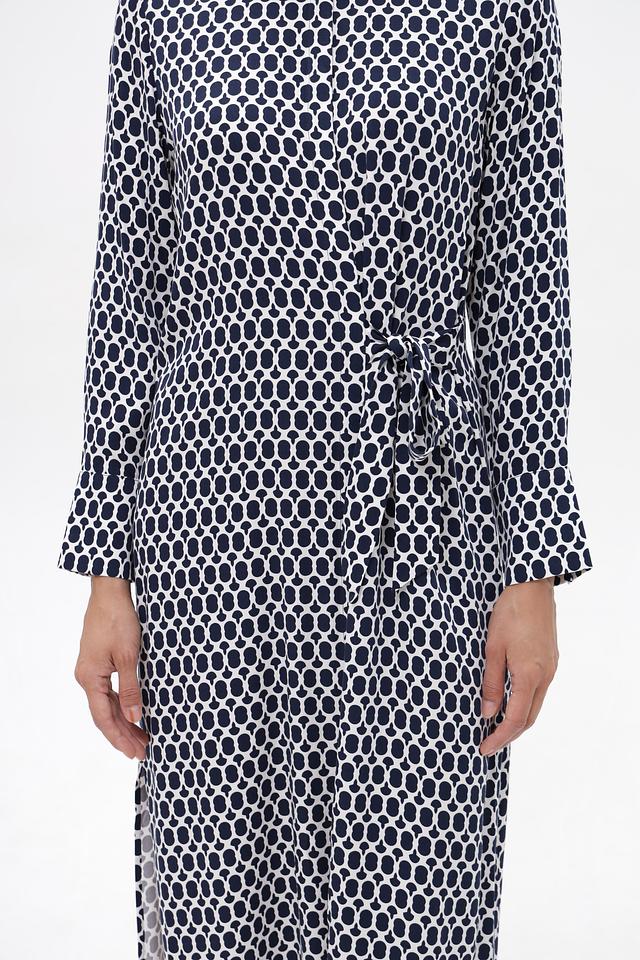 Платье имеет прямой крой, воротник-стойку и длинные рукава. Завязывающийся пояс позволяет подчеркнуть талию и создать более женственный силуэт. Модель выполнена из 100% вискозы, что обеспечивает комфорт и приятные ощущения при носке.