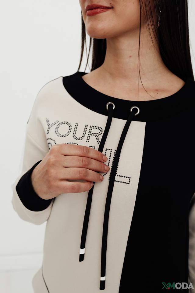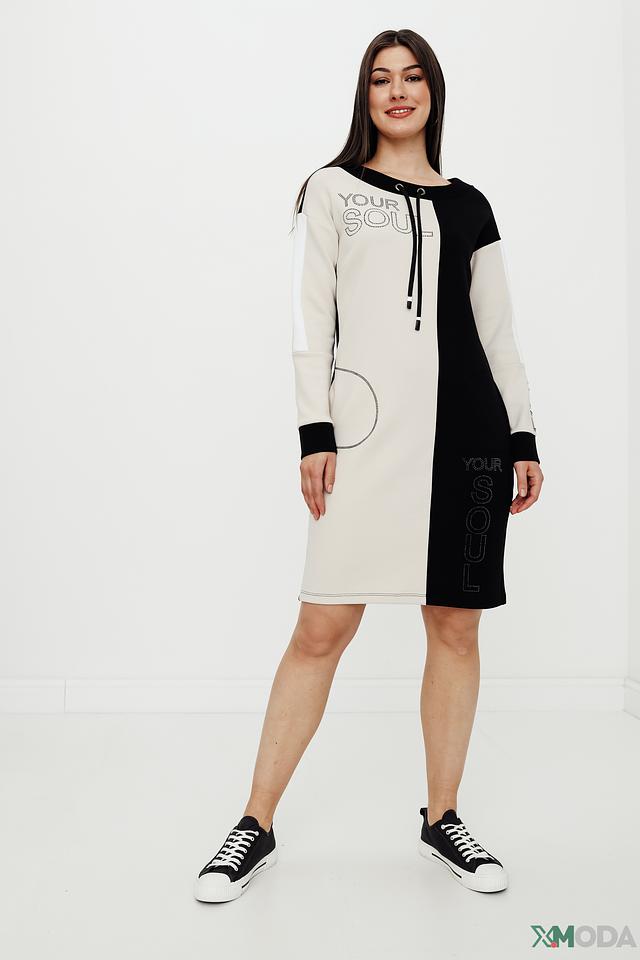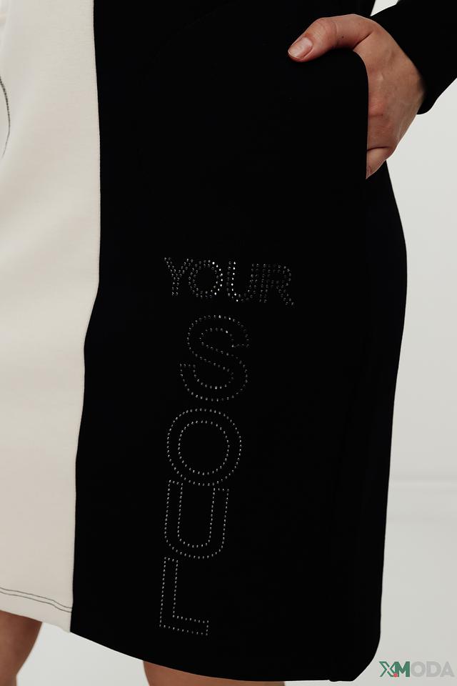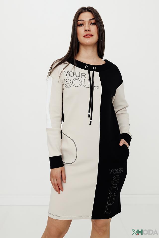 Платье имеет прямой силуэт, длину до колена и удобный капюшон со шнурками. На передней части платья расположен яркий принт с надписью "YOUR SOUL", выполненный в виде декоративной отделки. Боковые карманы добавляют практичности.