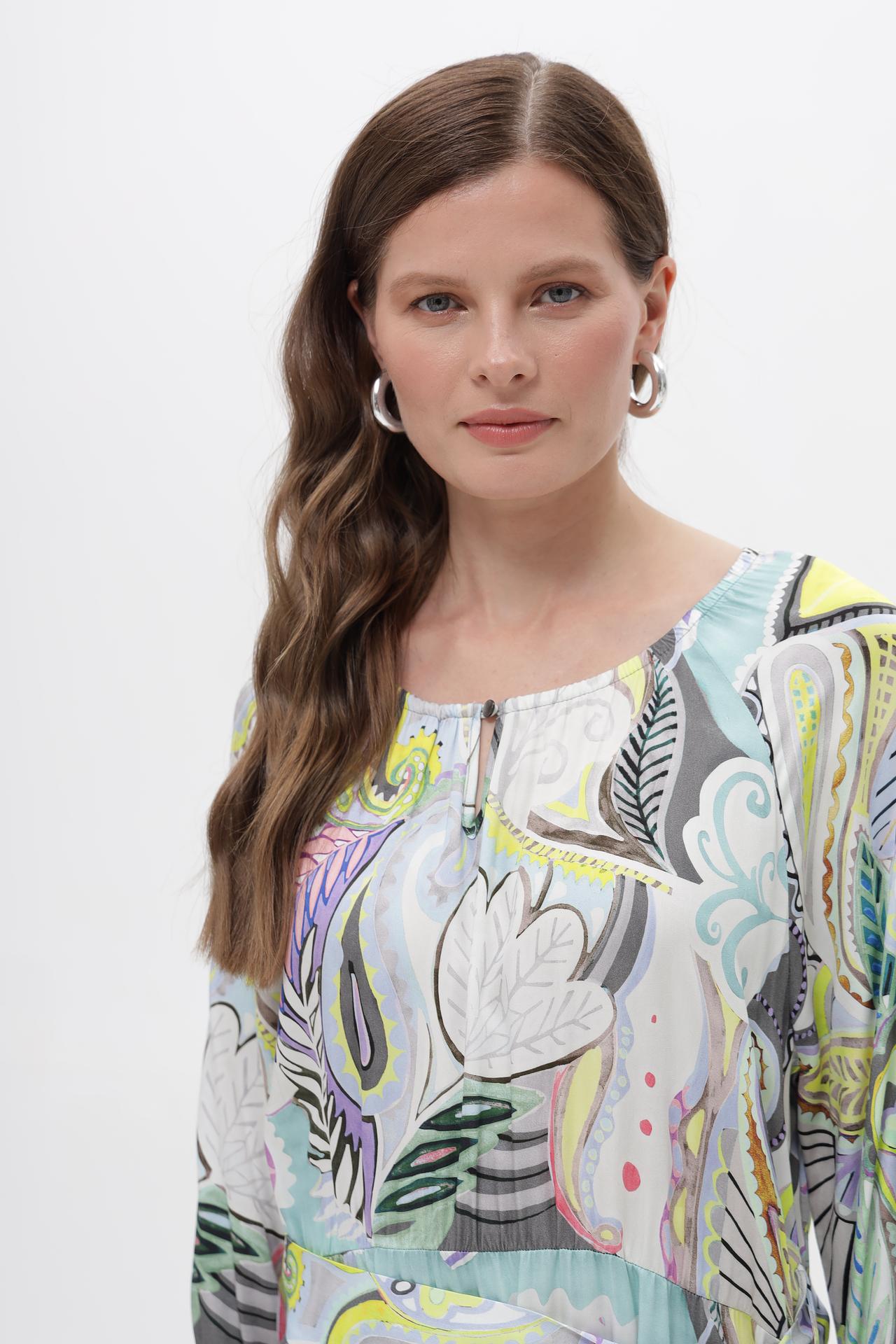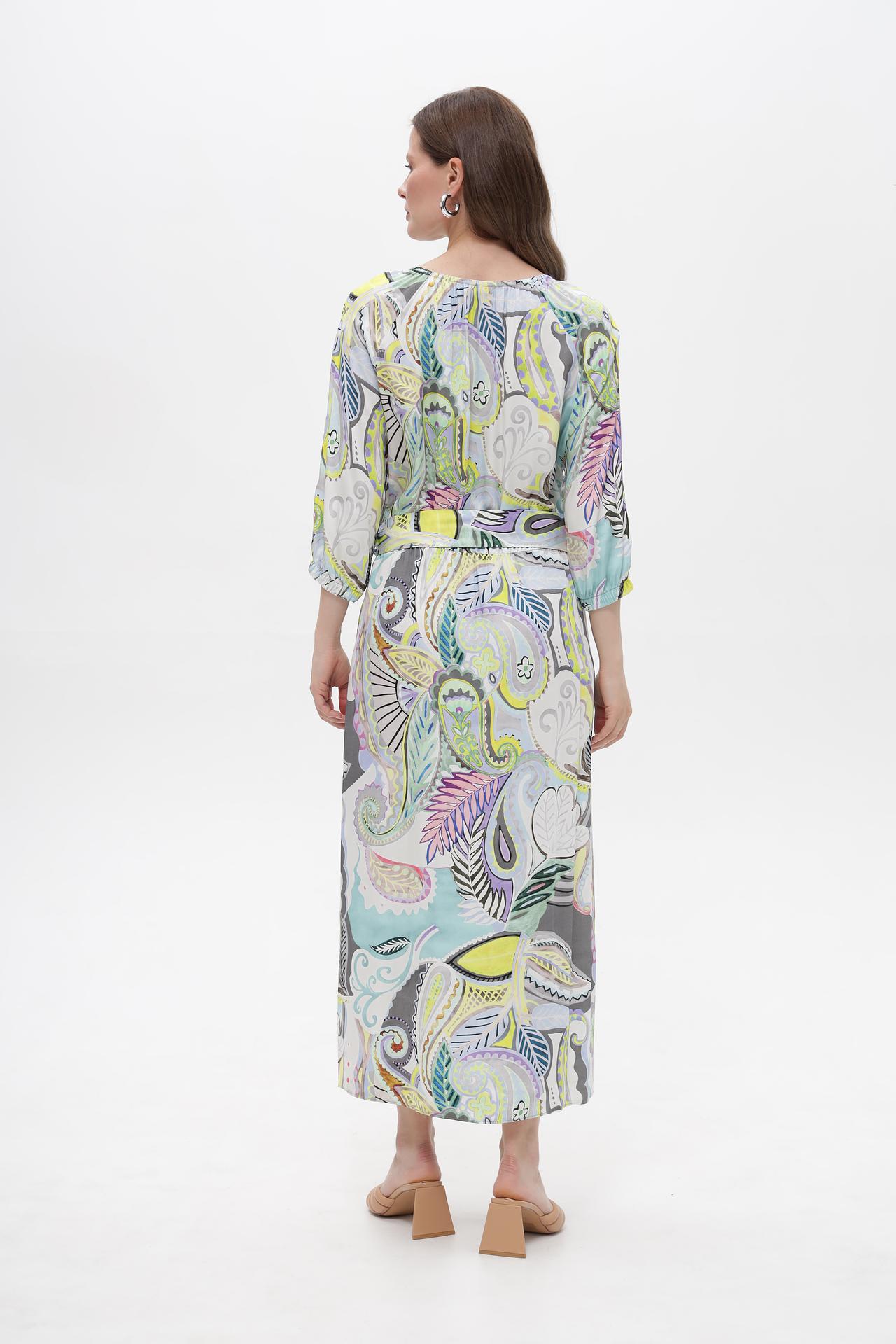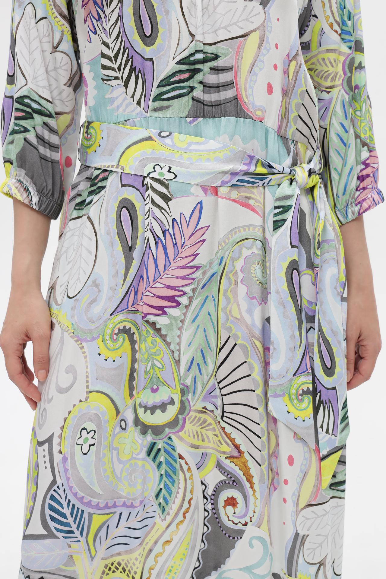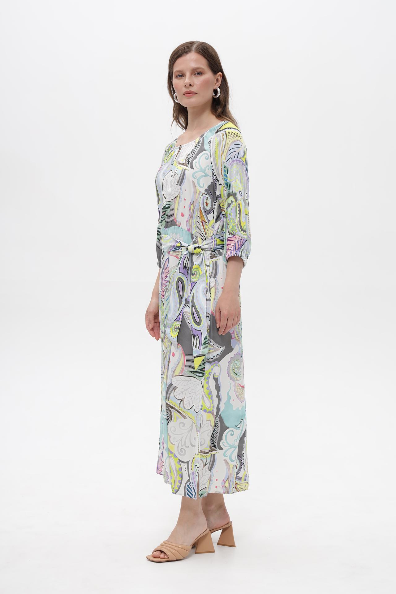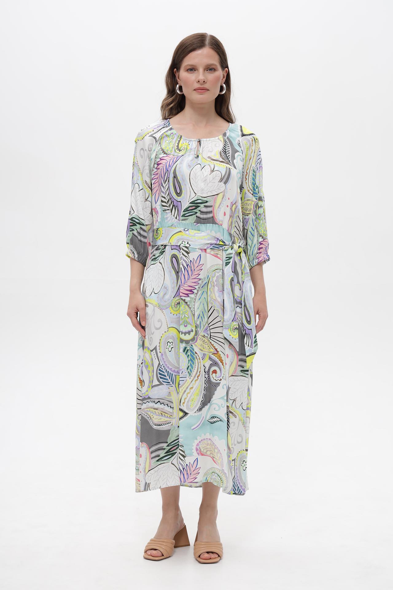 Платье выполнено в нежном, разноцветном принте. Легкая ткань из вискозы обеспечивает приятные ощущения при носке. Мягкий материал позволяет коже дышать, что делает это платье идеальным выбором для жаркой погоды. Свободный крой обеспечивает свободу движений, а пояс подчеркивает талию, создавая женственный силуэт.