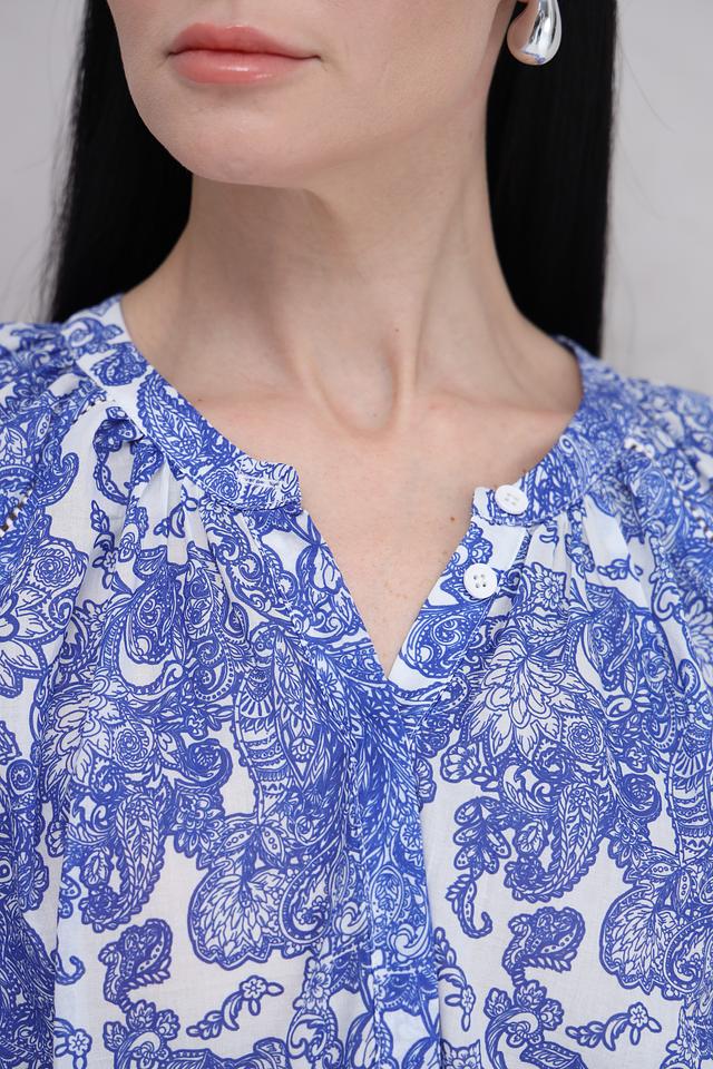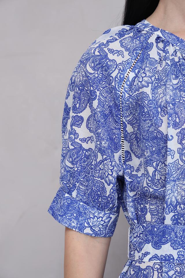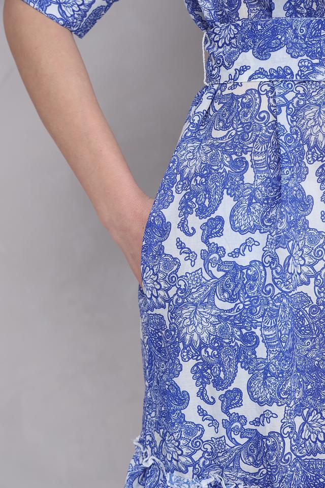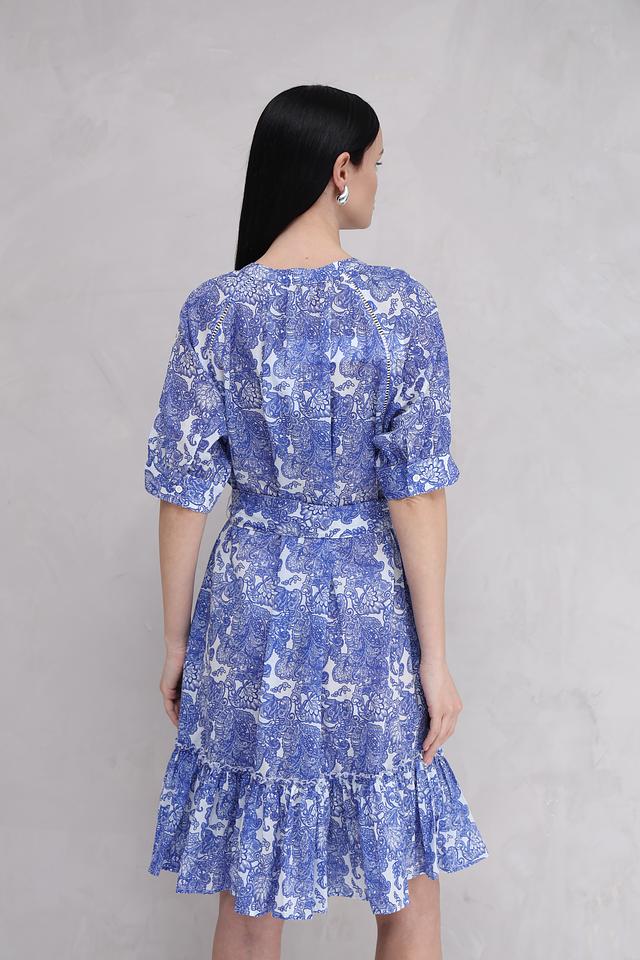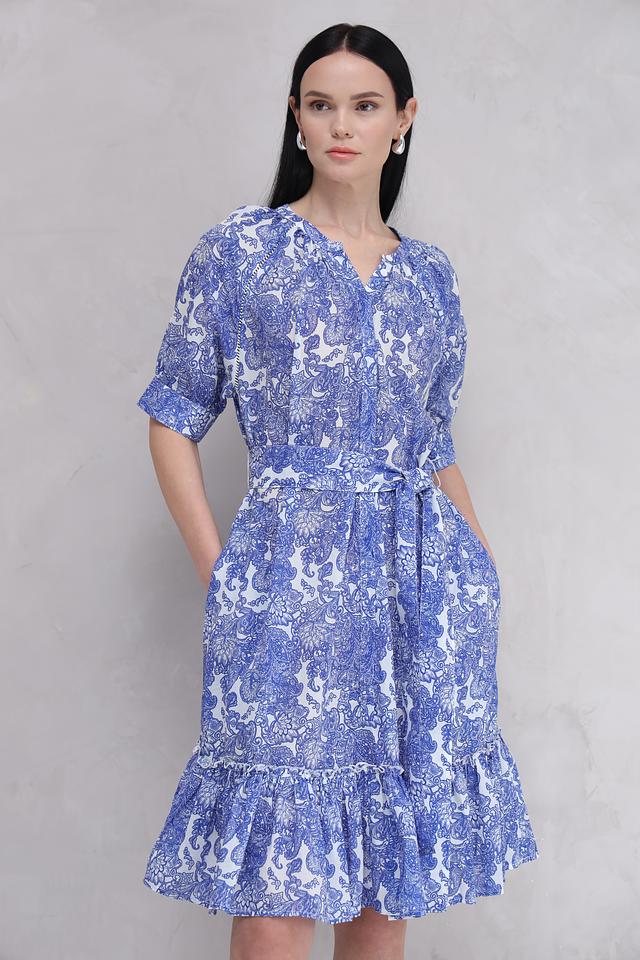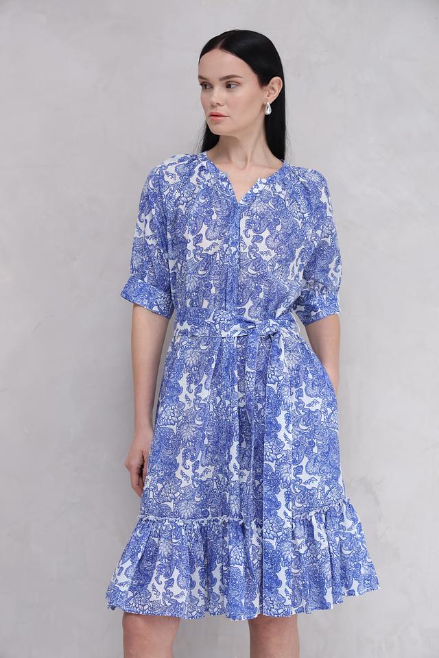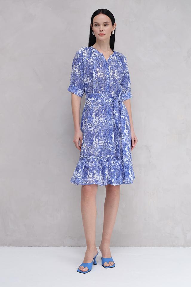 Модель имеет длину до колена, V-образный вырез и короткие рукава с небольшими оборками. Платье украшено ярким цветочным принтом в голубых и белых тонах. Подчеркнуть талию поможет съёмный пояс.