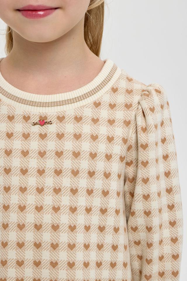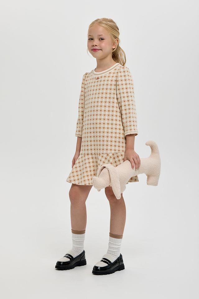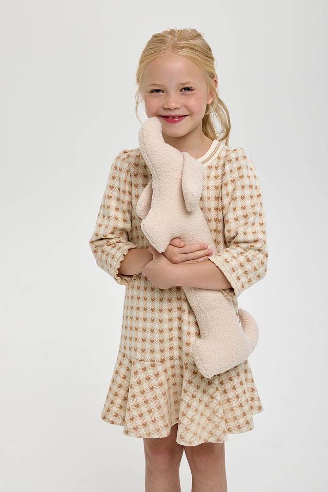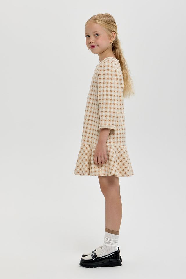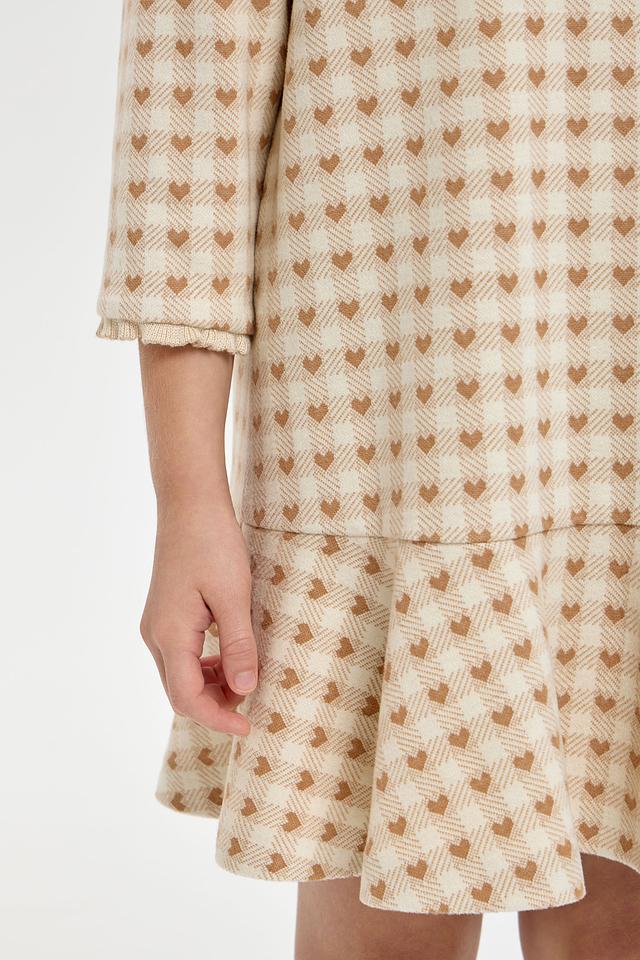 Платье выполнено в приятной кремовой цветовой гамме и украшено милым принтом в клетку, в котором спрятаны маленькие сердечки. Фасон платья – свободный, с небольшим расклешением к низу, что обеспечивает свободу движений и комфорт во время активных игр.