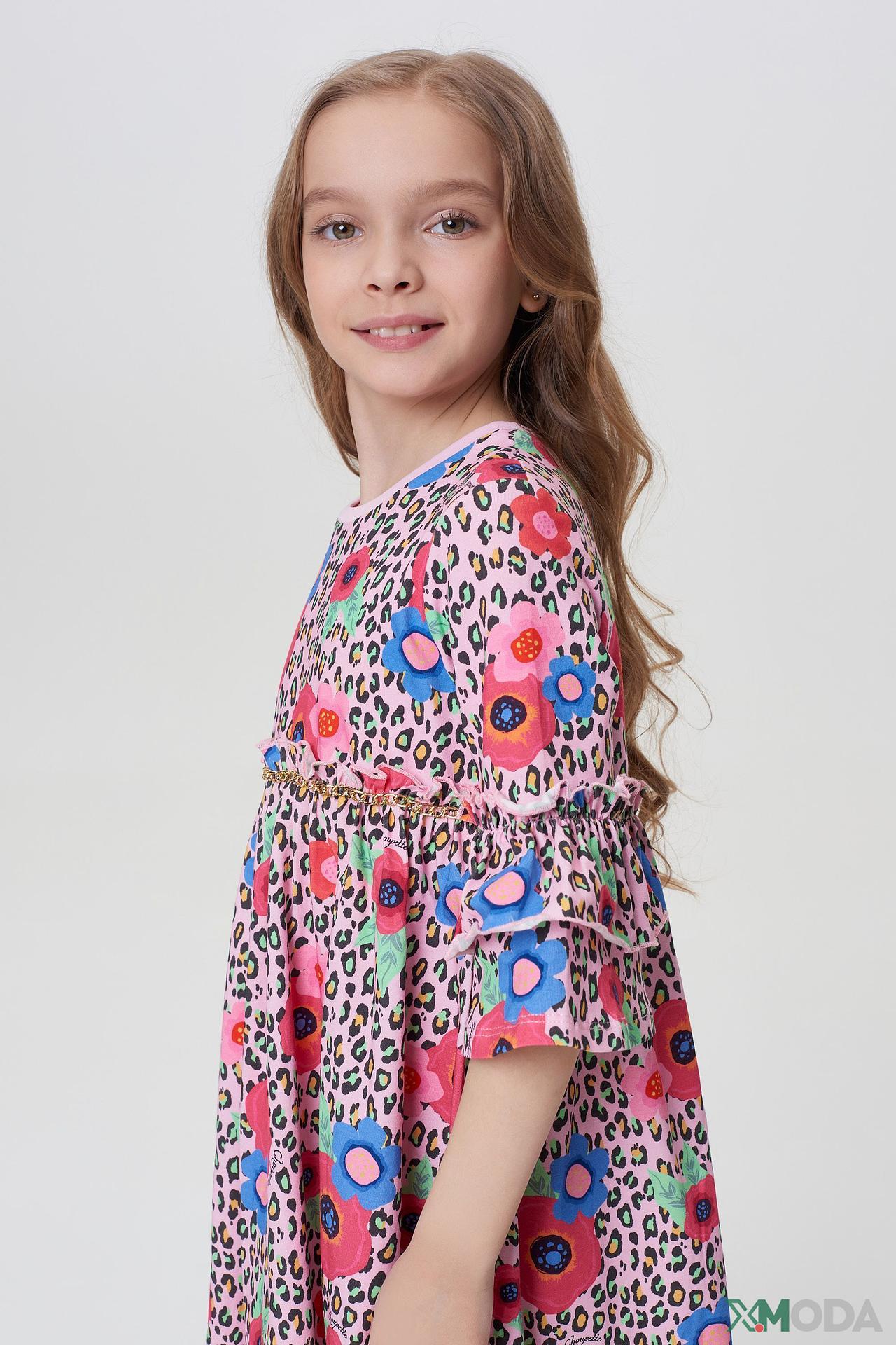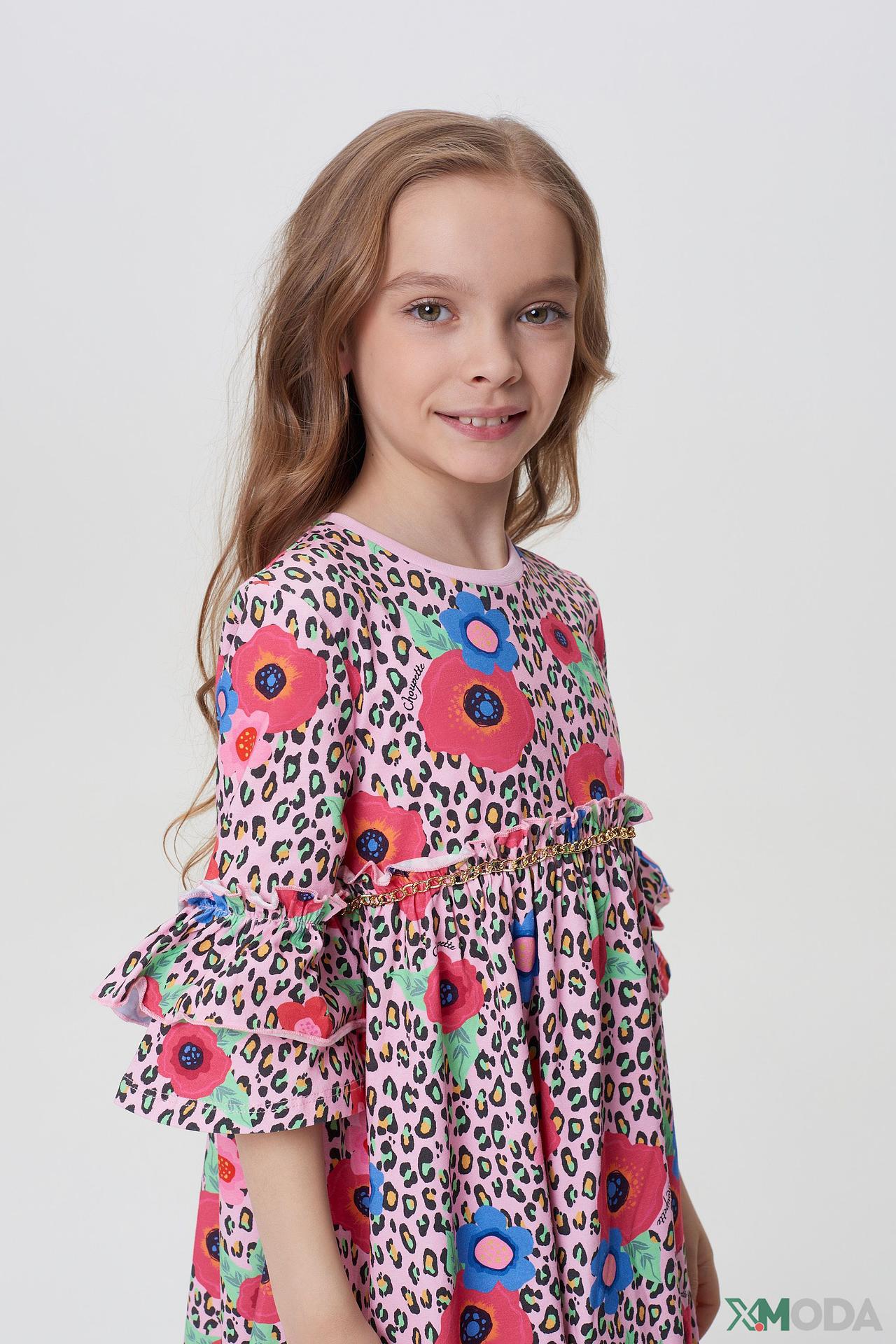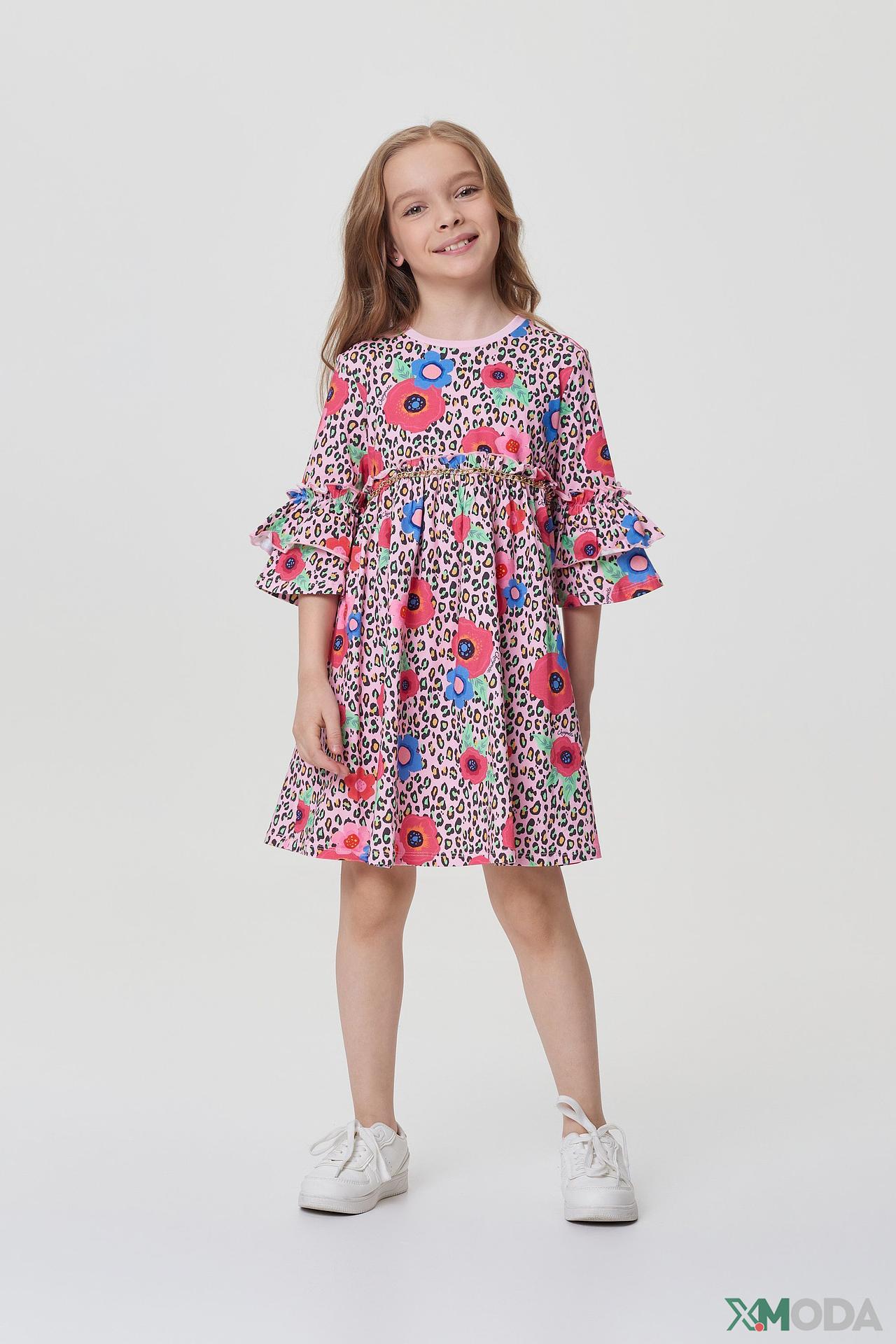 Розовое платье с ярким цветочным принтом и леопардовым узором станет любимым нарядом маленькой модницы. Оригинальные рукава с оборками добавляют образу легкости и игривости. Подходит для праздников и для повседневной носки, не сковывает движения, позволяя ребенку чувствовать себя уверенно и комфортно.