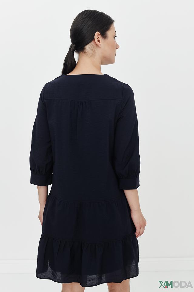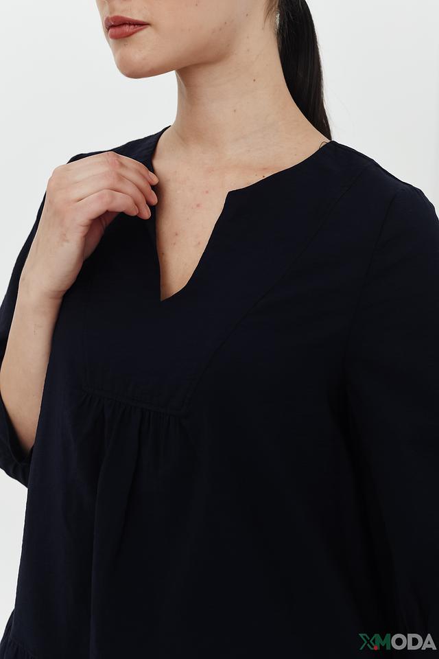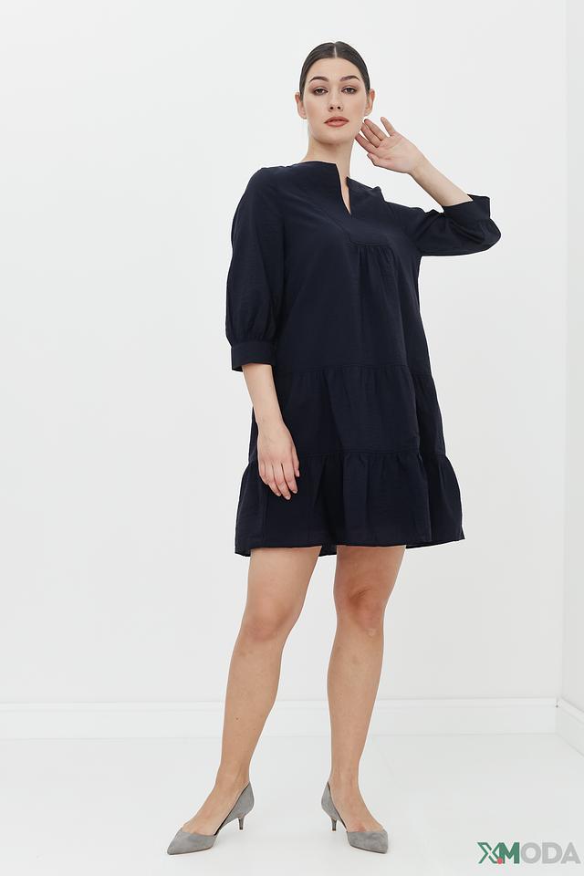 Темно-синее платье от Comma свободного кроя с рукавами 3/4 и V-образным вырезом. Платье выполнено из смесовой ткани с добавлением хлопка, что обеспечивает комфорт и воздухопроницаемость. Отличный выбор для создания повседневного образа. Состав: Состав_подкладка вискоза 100%, хлопок 73%, полиамид 27%