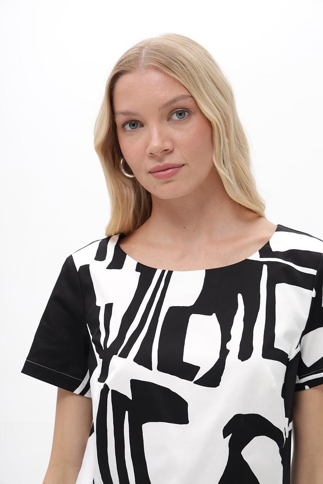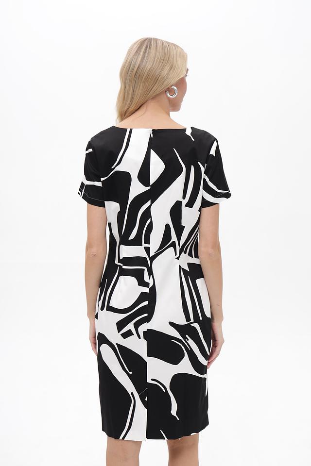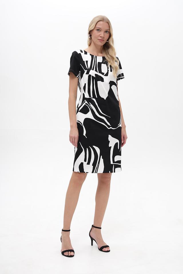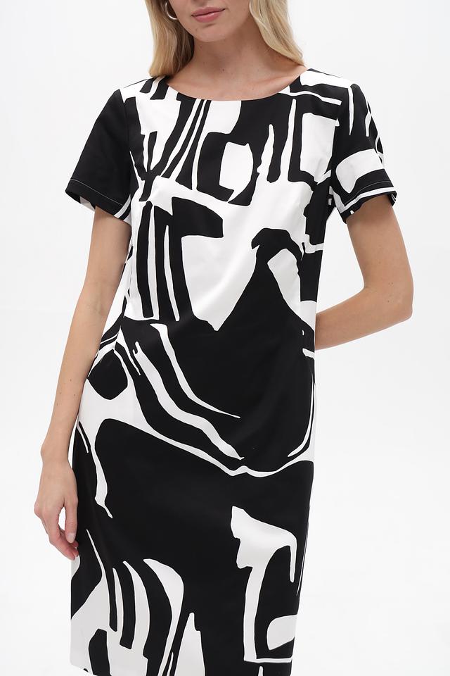 Платье имеет короткие рукава и округлый вырез горловины. Приталенный силуэт подчеркивает достоинства фигуры, а оригинальный черно-белый принт делает образ запоминающимся и современным.