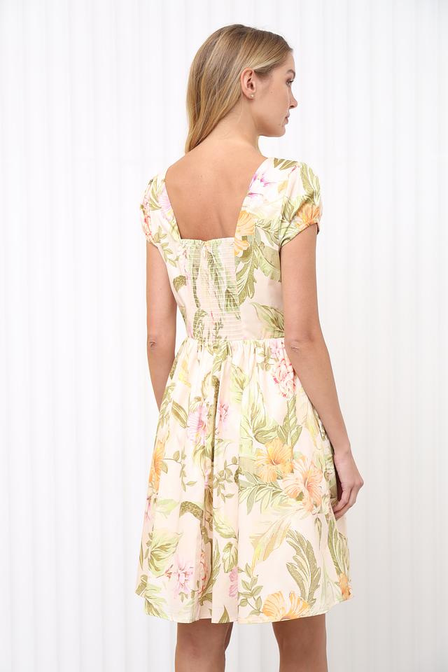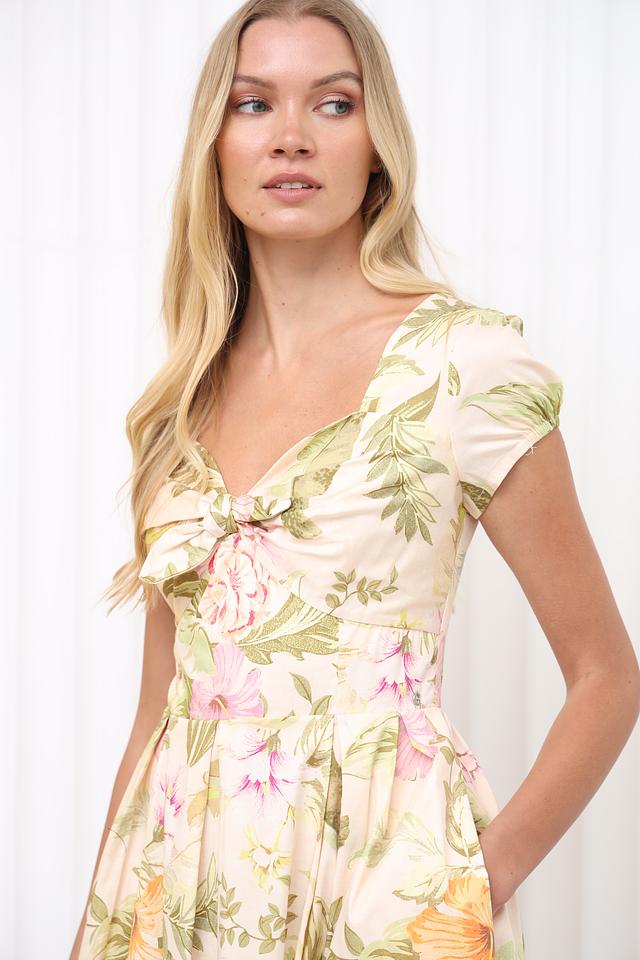 Основной цвет платья – нежный бежевый, который служит идеальным фоном для яркого цветочного принта. Принт выполнен в пастельных тонах, включая розовый, желтый и зеленый, что придает платью легкость и свежесть.