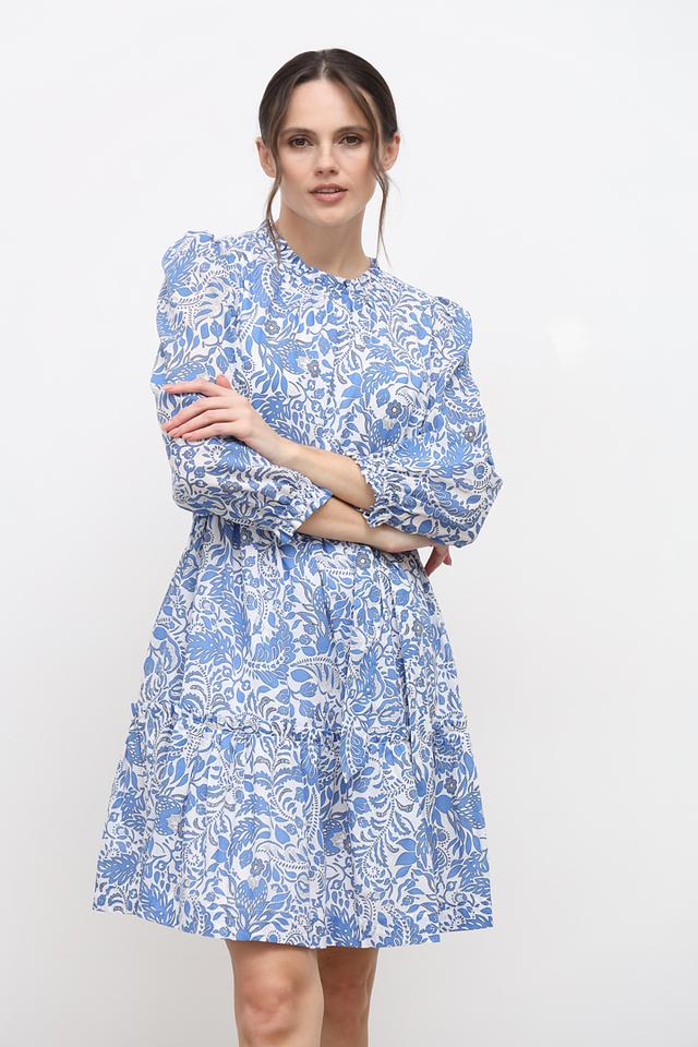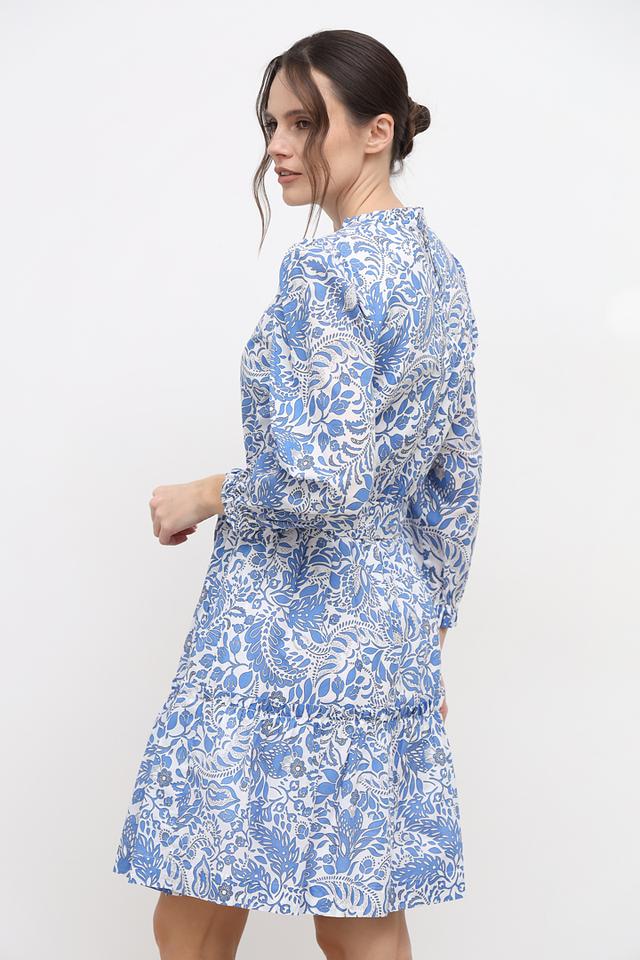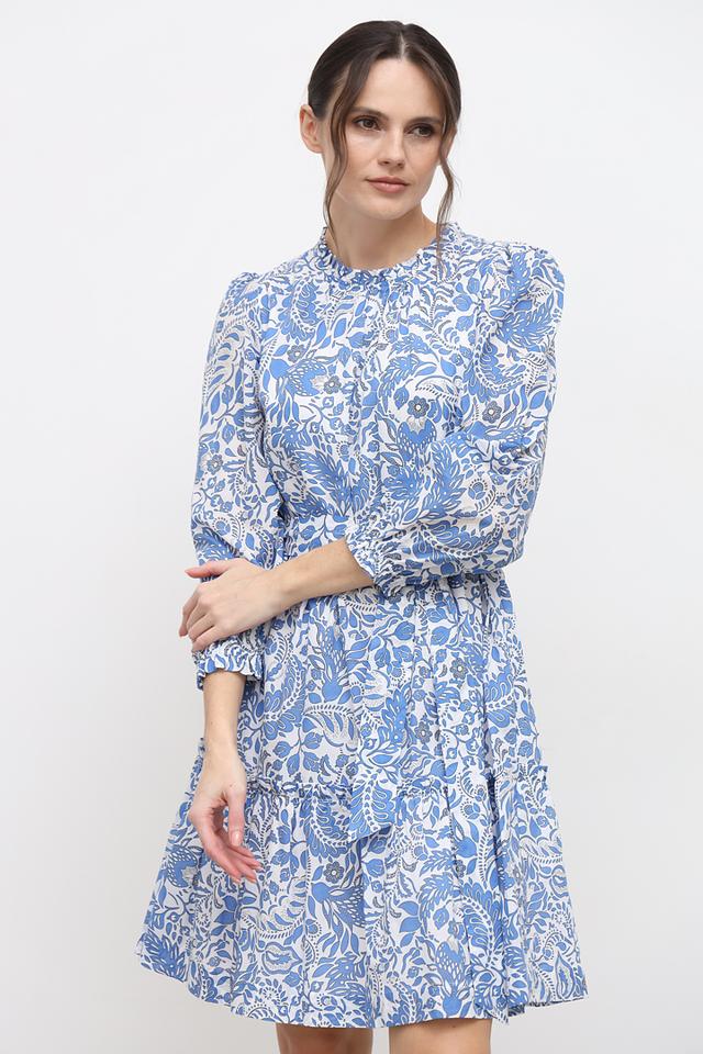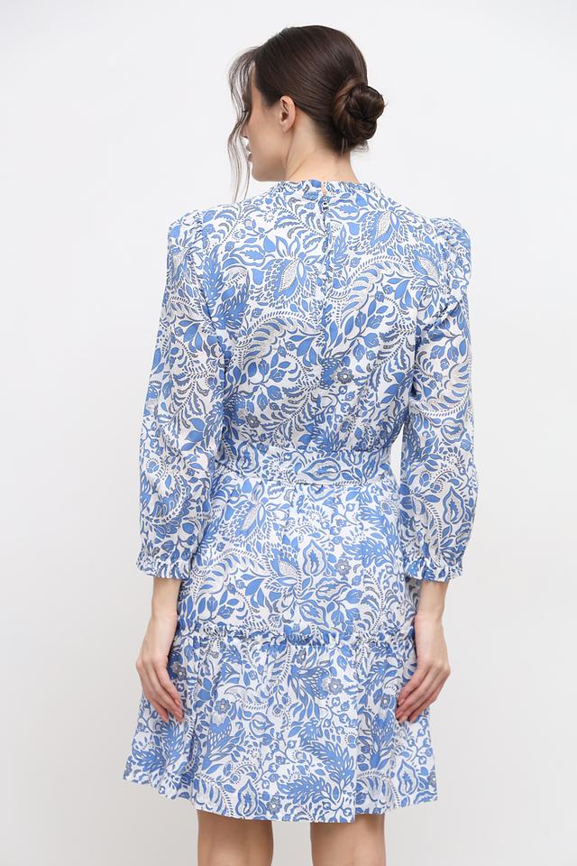 Дизайн платья представлен в виде изысканного цветочного принта, сочетающего в себе различные оттенки голубого и белого цветов. Силуэт платья приталенный, с акцентом на талии благодаря поясу. Рукава длиной 3/4 добавляют образу женственности и лёгкости.