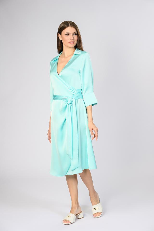 Платье оснащено съёмным поясом, который можно завязать на талии, чтобы создать более выразительный силуэт. Длина миди делает его универсальным для различных случаев – от деловых встреч до вечерних мероприятий. Преобладающий цвет – нежный бирюзовый, который освежает образ и подходит к разным оттенкам кожи.