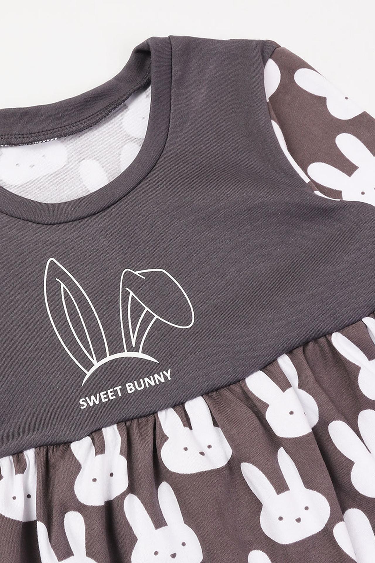 Платье для девочки от бренда КотМарКот – это идеальный выбор для создания милого и комфортного образа. Изделие выполнено в приятном сером цвете и украшено очаровательным принтом с изображением белых зайчиков, а также надписью "SWEET BUNNY" и аппликацией в виде ушек на груди. Модель с длинным рукавом и расклешенной юбкой отлично подойдет для повседневной носки и праздничных случаев.