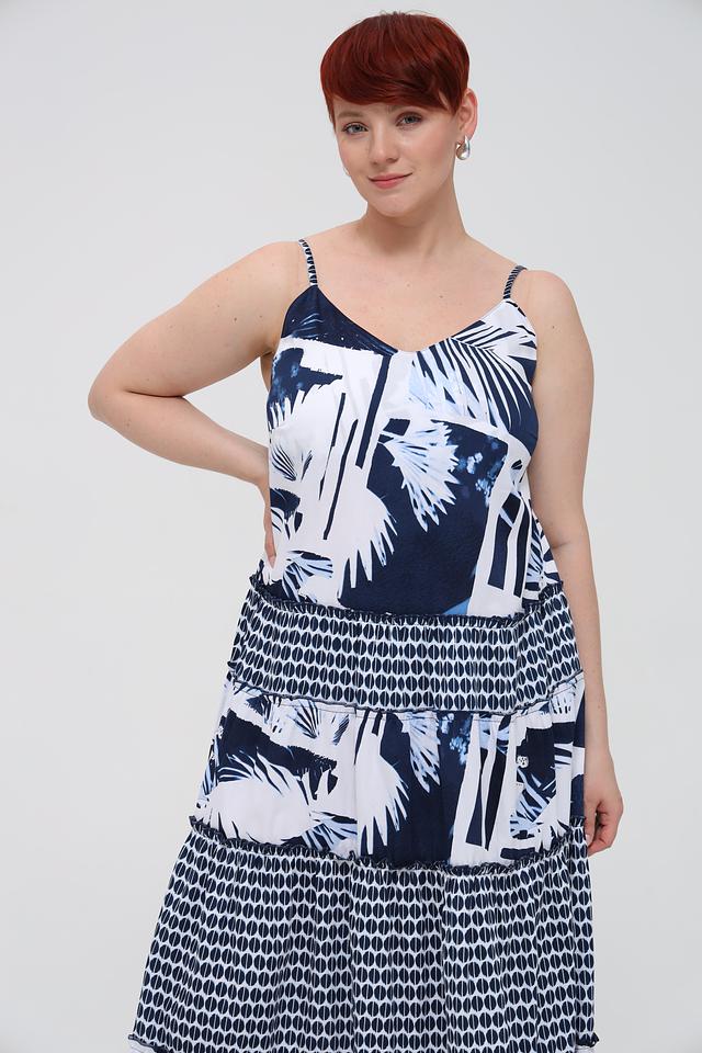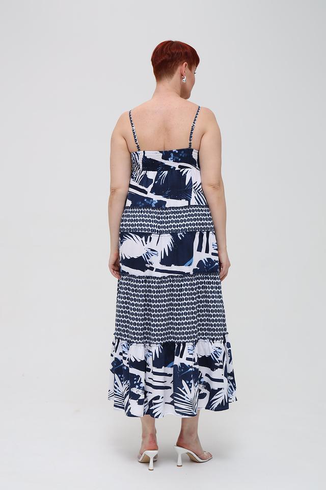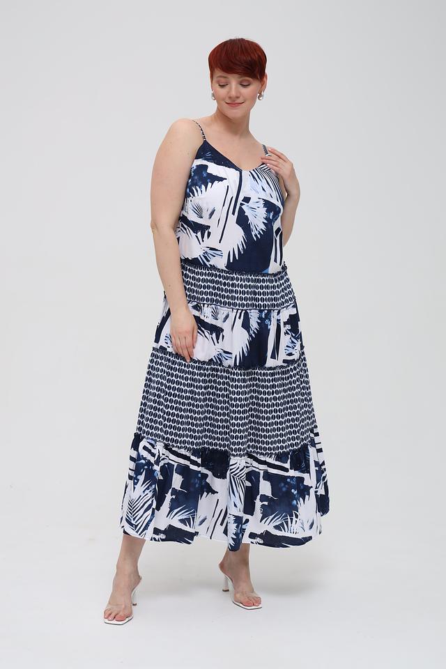 Основной цвет платья – синий, украшен ярким принтом с изображением тропических листьев и цветов. Верх платья имеет лиф с тонкими бретелями, а юбка выполнена в форме ярусов, что придает образу легкость и динамичность.