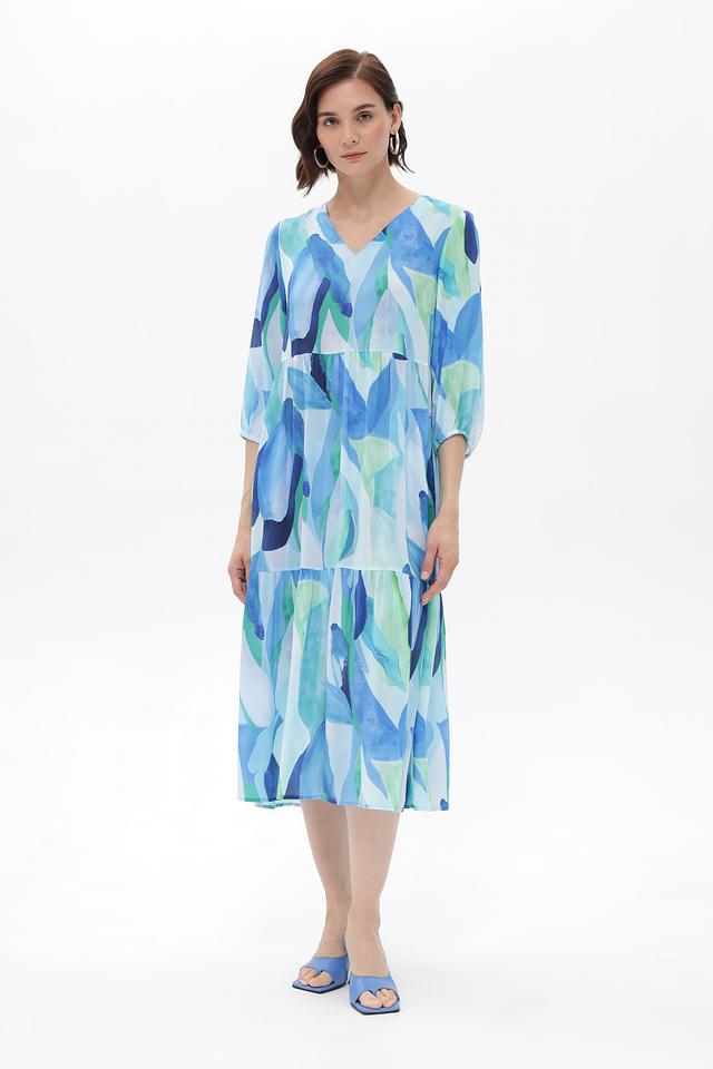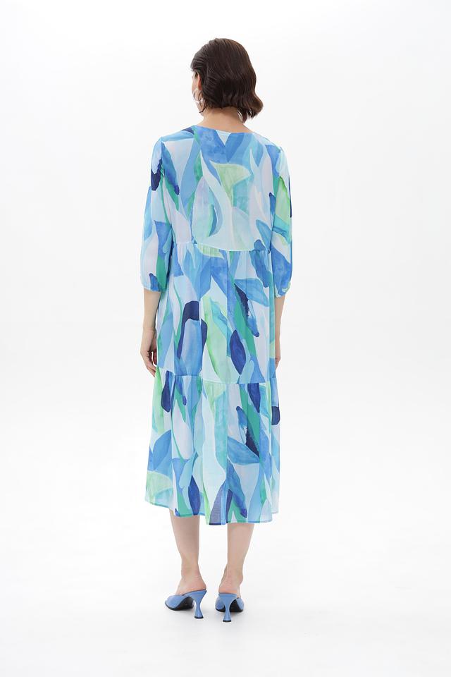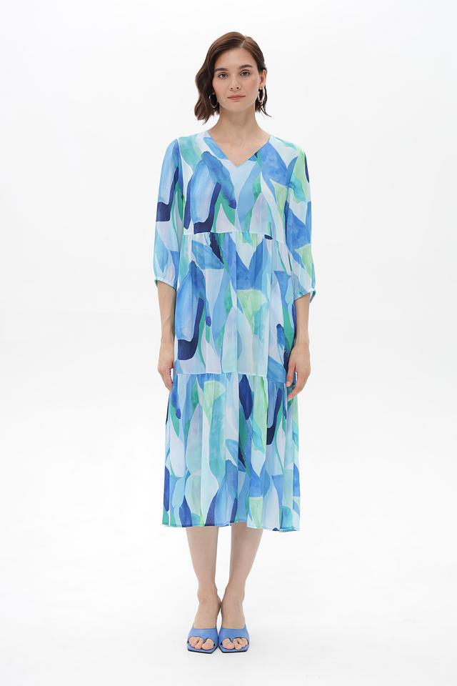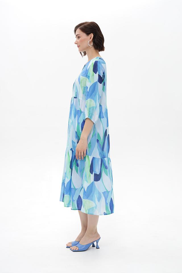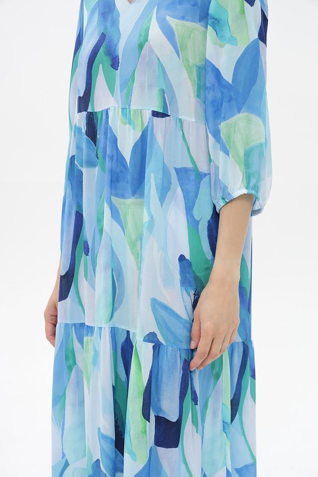 Особенностью этого платья является его яркий и необычный абстрактный принт в голубых и зелёных тонах. Силуэт платья свободный, А-образный, с заниженной линией талии и многослойной юбкой, что придает ему лёгкость и воздушность. V-образный вырез горловины и рукава 3/4 добавляют изящества.