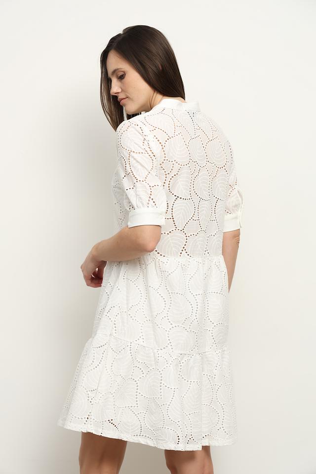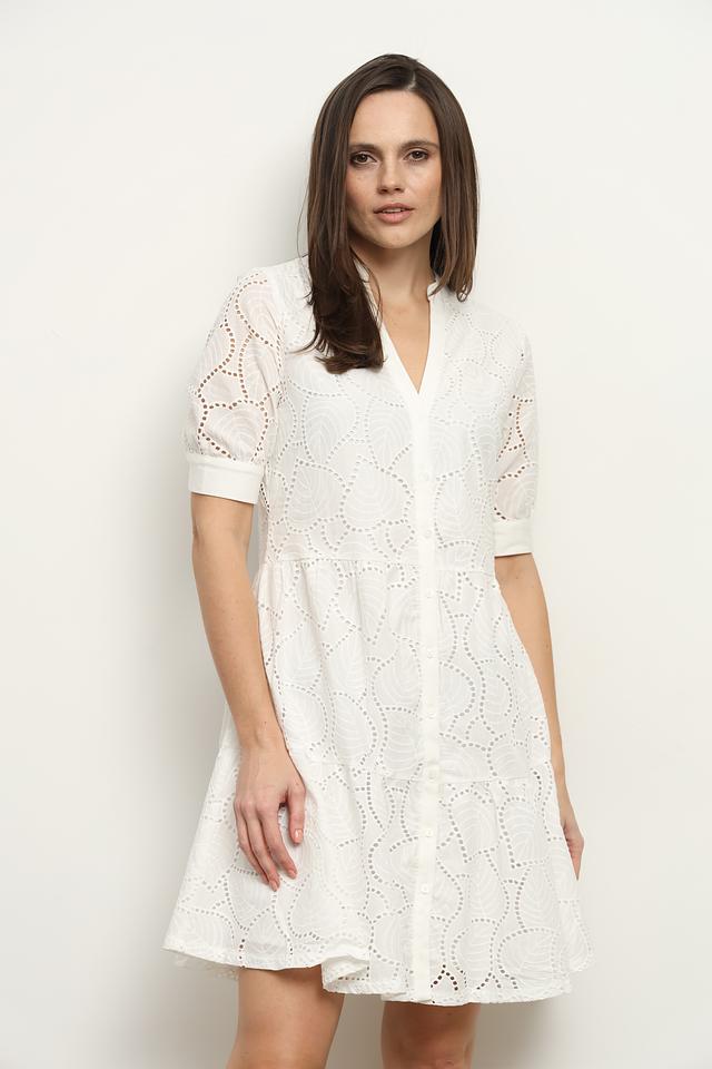 Основной цвет платья – белый. Оно украшено изысканной ажурной вышивкой, создающей неповторимый и женственный образ. V-образный вырез подчеркивает линию шеи, а короткие рукава делают платье удобным для повседневной носки.