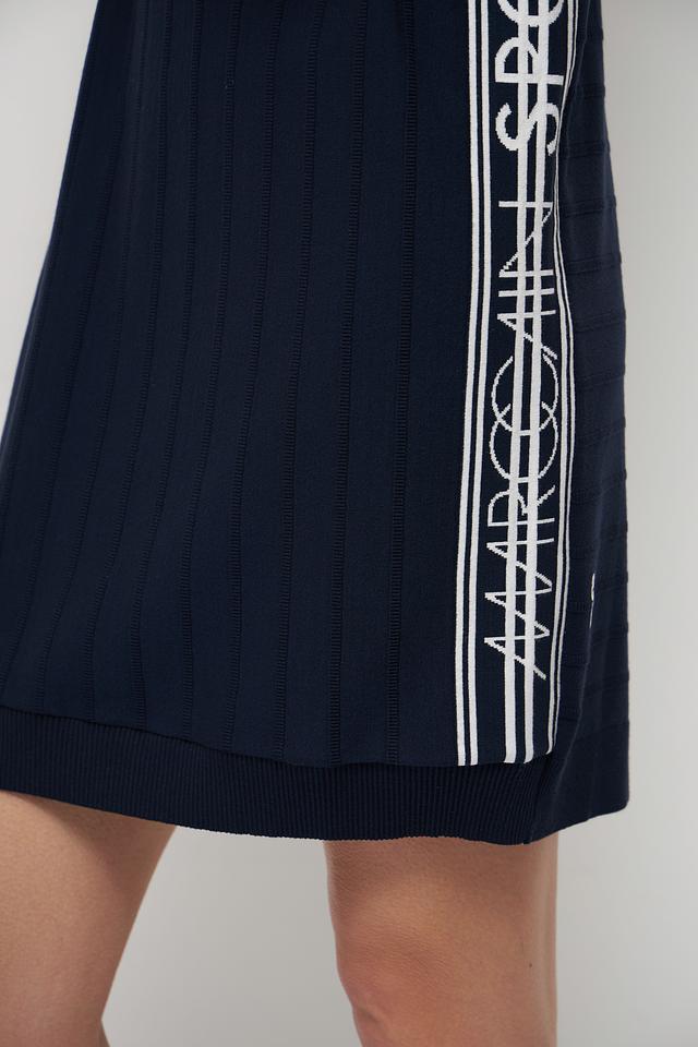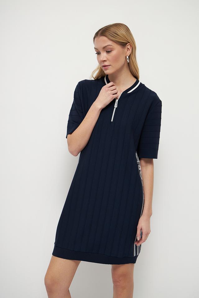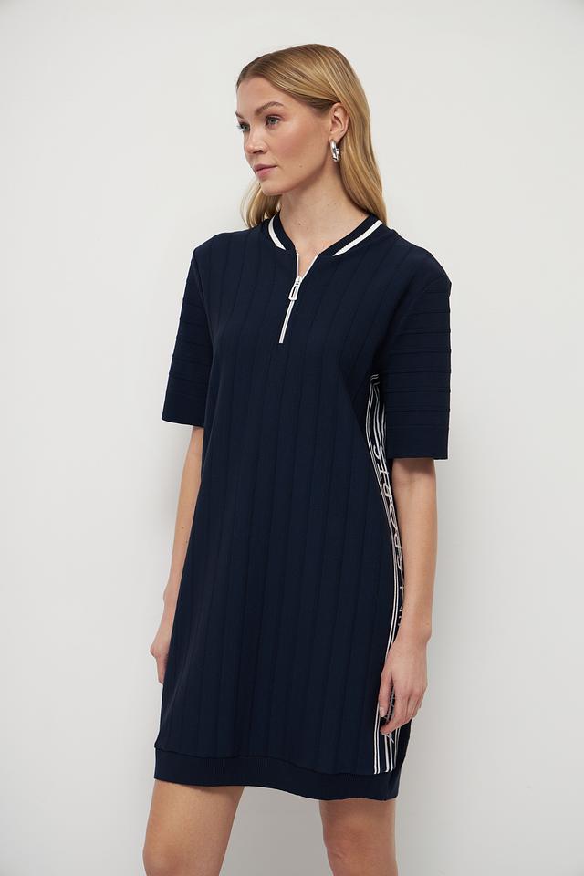 Темно-синее платье Marc Cain Sports из трикотажа с короткими рукавами и молнией. Удобный крой и спортивный стиль делают его отличным выбором для повседневной носки. Декорировано белыми полосками. Состав: вискоза 70%, полиэстер 30%