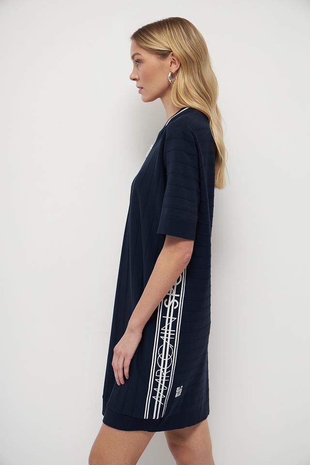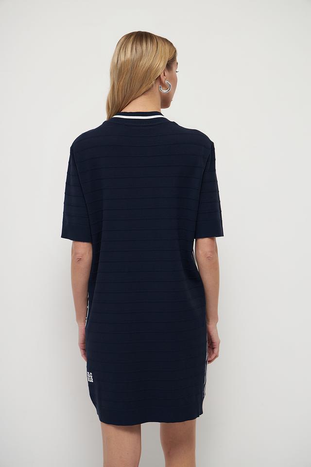 Платье имеет прямой силуэт, короткие рукава и удобную застежку-молнию на горловине. Белые полосы по бокам и на воротнике добавляют спортивный акцент и визуально вытягивают фигуру. Дизайн платья лаконичный и современный, что делает его подходящим для различных случаев.