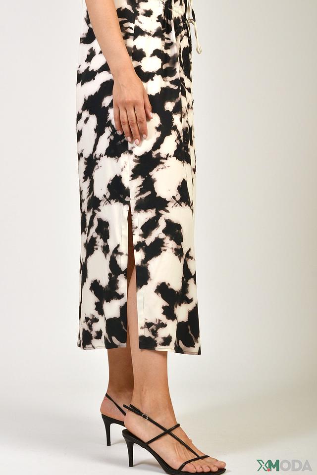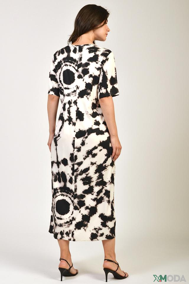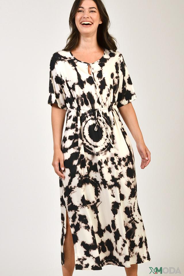 Платье Erfo чёрно-белого цвета с оригинальным принтом в стиле тай-дай. Легкая вискоза и свободный крой обеспечивают комфорт и свободу движений, а V-образный вырез и боковой разрез добавляют образу женственности. Состав: вискоза 95%, эластан 5%
