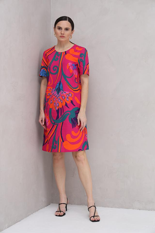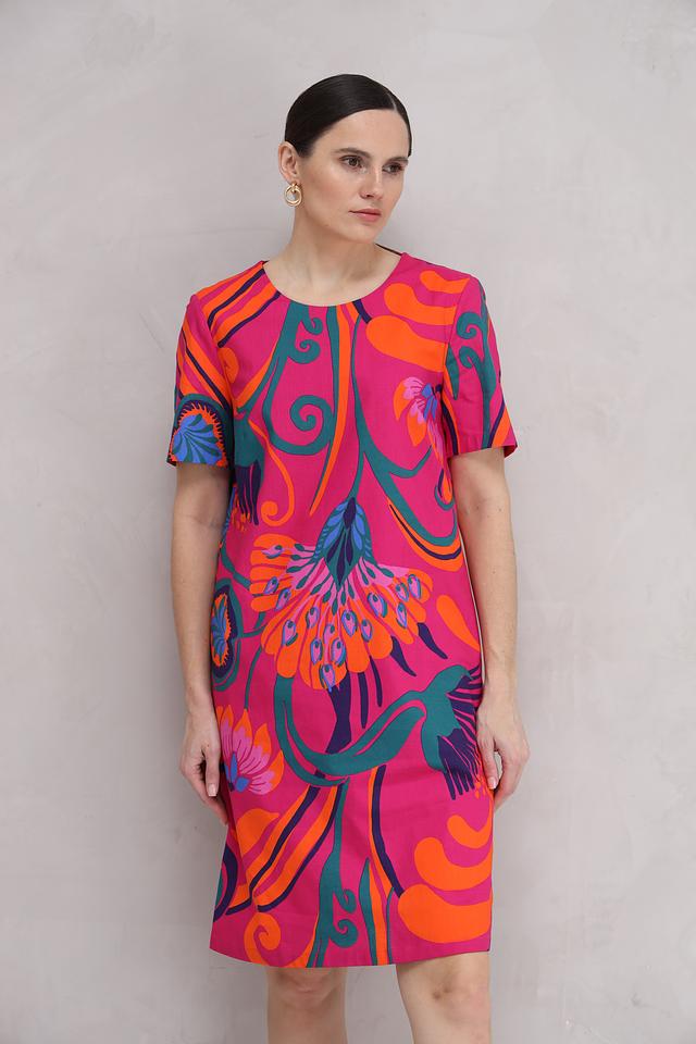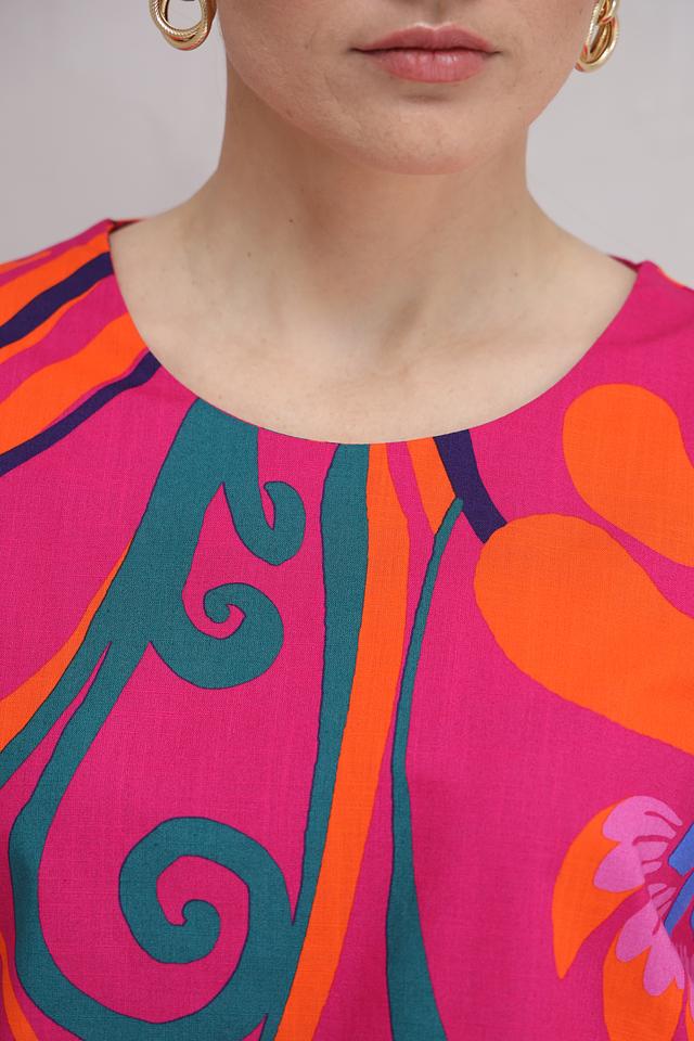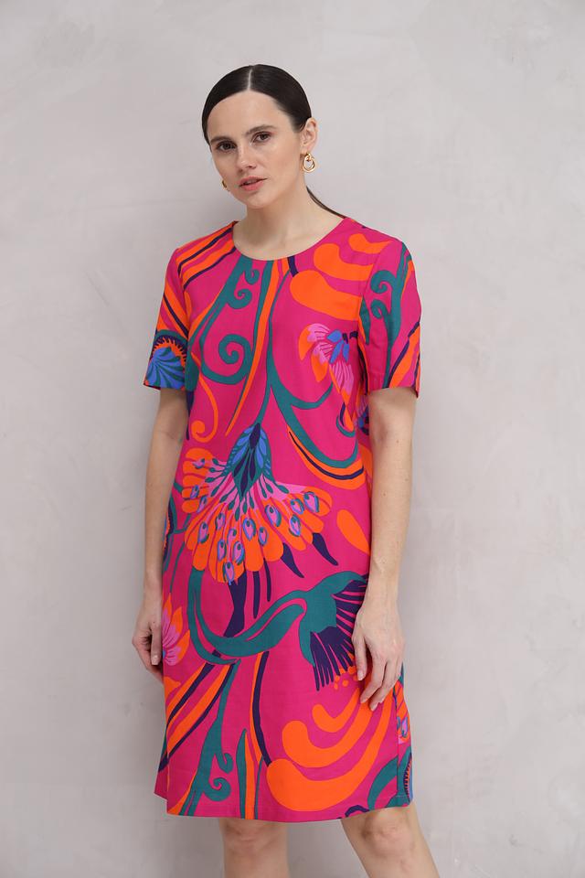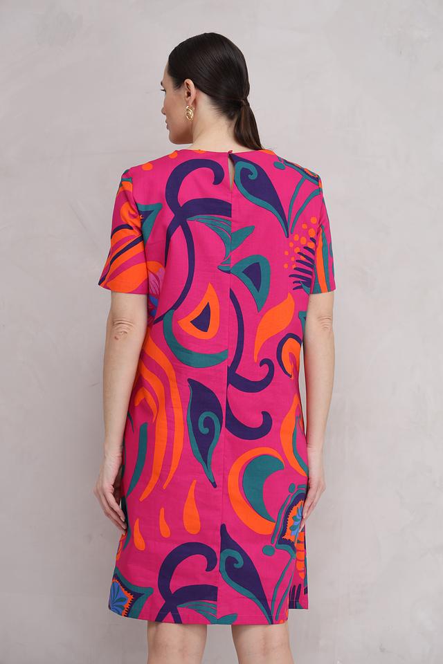 Платье имеет прямой силуэт и длину чуть выше колена. Круглый вырез горловины и короткие рукава делают его идеальным для теплой погоды. Главная особенность этого платья – его уникальный и красочный принт, сочетающий в себе оранжевые, бирюзовые и фиолетовые оттенки на розовом фоне.