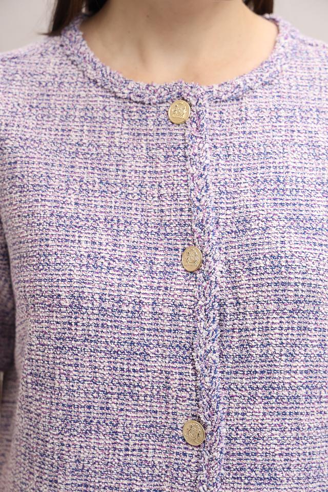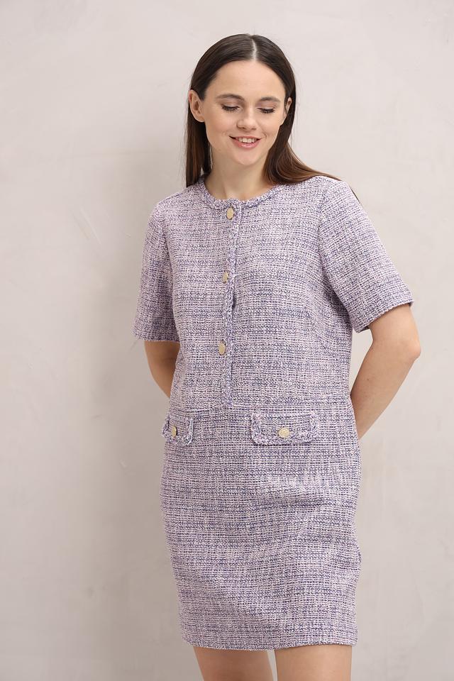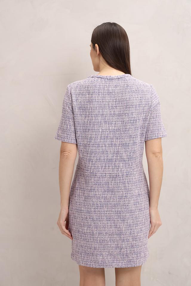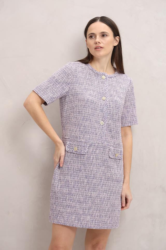 Платье Oui из текстурированной ткани в клетку сине-белого цвета с короткими рукавами и золотистыми пуговицами. Элегантный силуэт и удобный крой делают его отличным выбором для повседневной носки. Состав: полиэстер 47%, хлопок 35%, вискоза 14%, метализ.нить 2%, эластан 1%, полиамид 1%