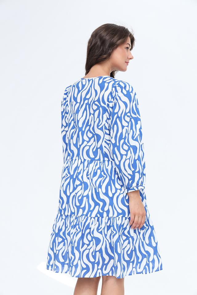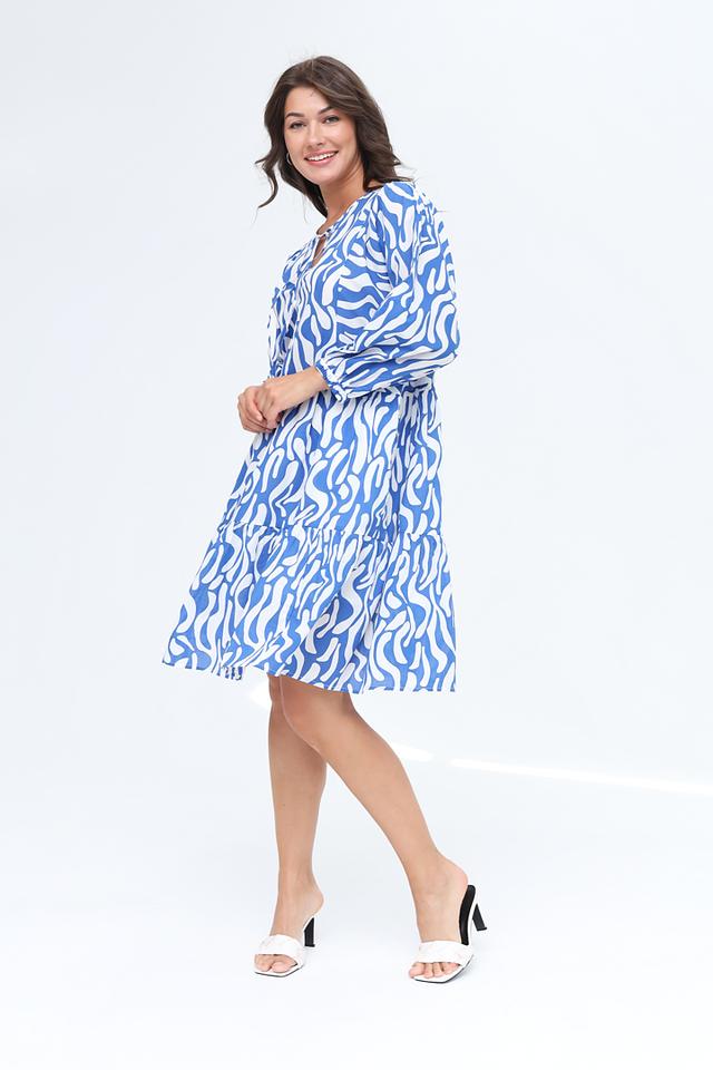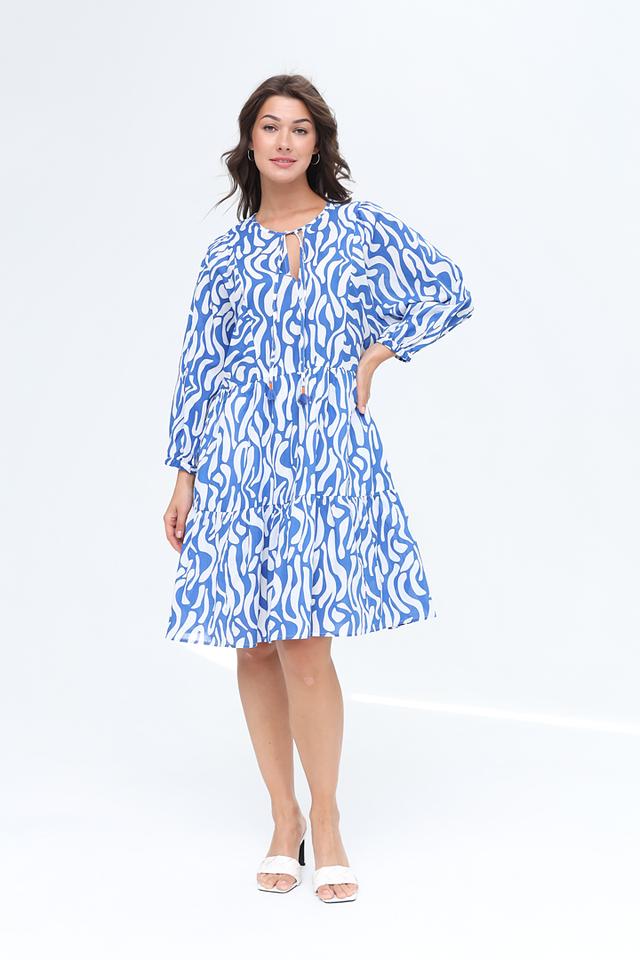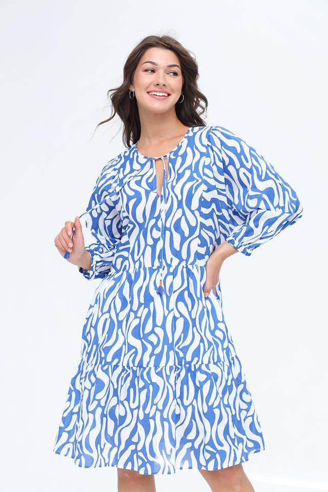 Платье от Oui голубого цвета с оригинальным волнистым принтом и рукавами 3/4. Легкая модель из 100% хлопка идеально подойдет для летних образов. Состав: хлопок 100%