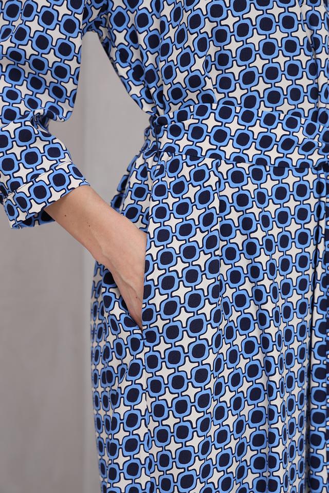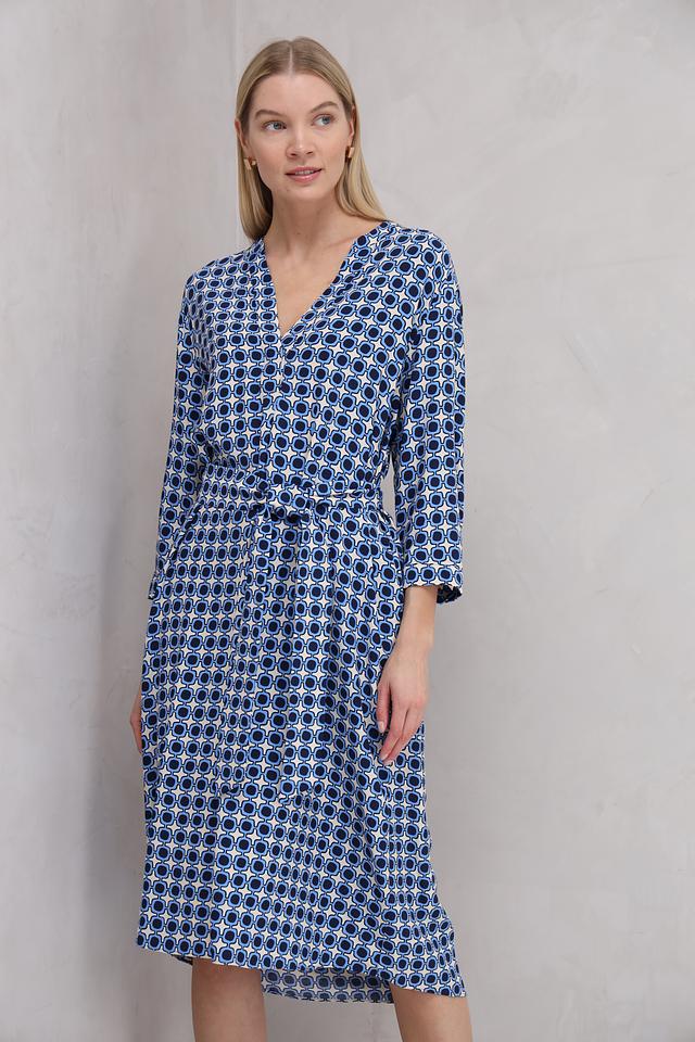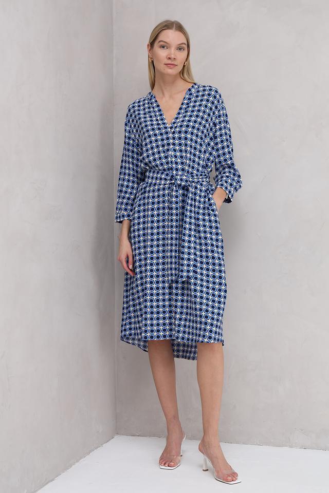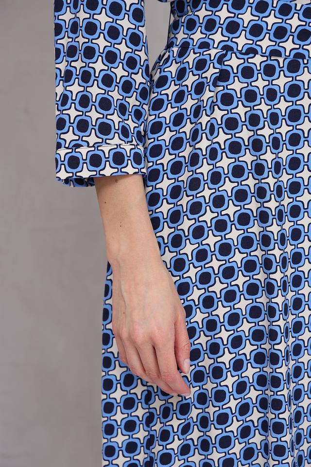 Особенностью модели является яркий геометрический принт в синих и белых тонах, который делает платье запоминающимся и стильным. V-образный вырез и рукава длиной 3/4 добавляют образу женственности и изящества.
