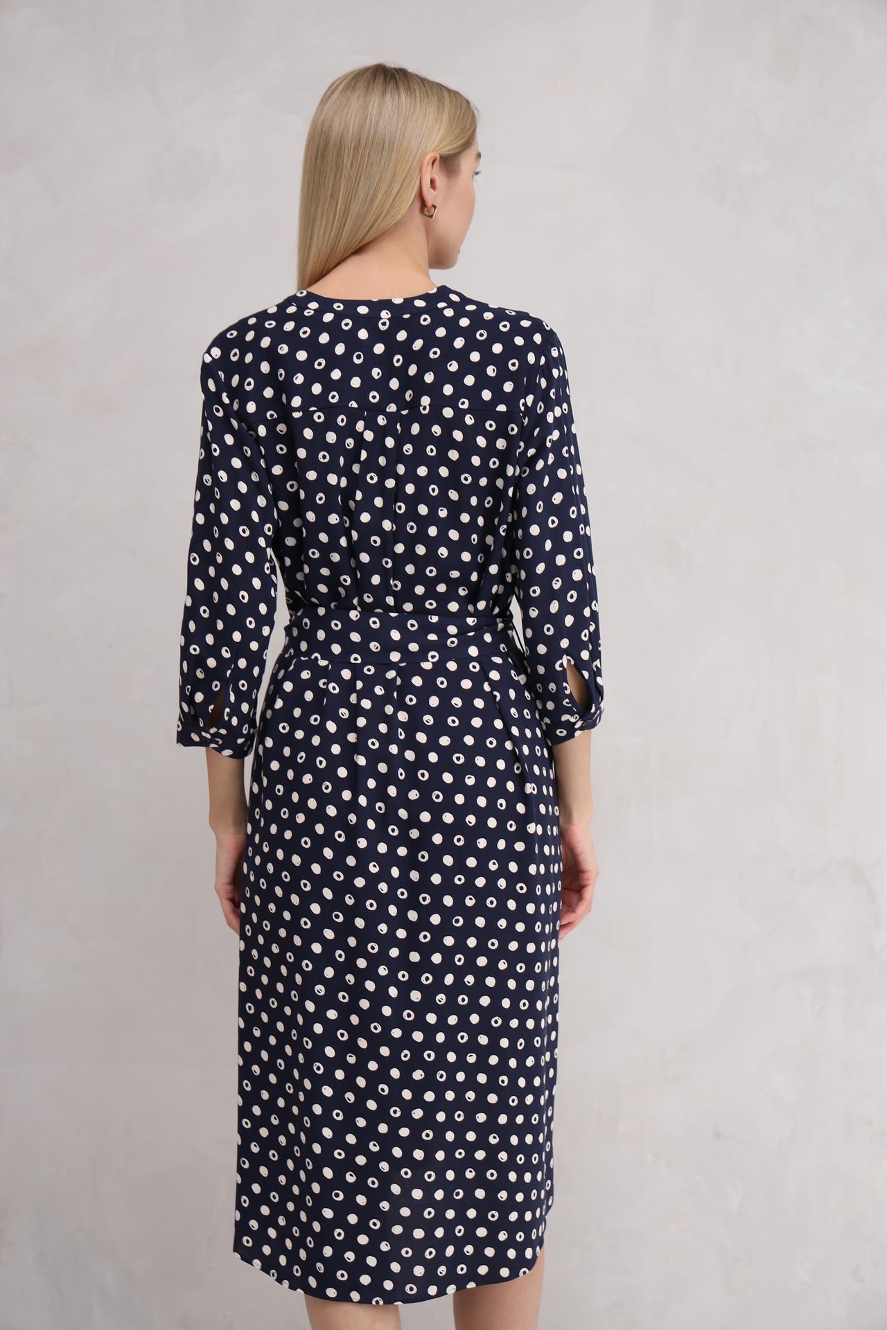 Нежный принт в горошек добавляет образу игривости и свежести. Платье дополнено поясом, который подчеркивает талию и создает элегантный силуэт. Идеальный выбор для стильных женщин, ценящих качество и удобство.