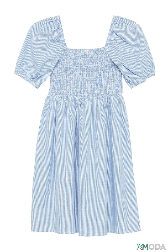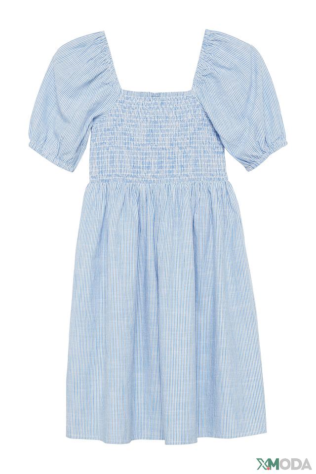 Модель имеет квадратный вырез горловины и короткие рукава-фонарики, собранные по краю манжетами. Линия талии подчеркнута сборкой, создающей лёгкий силуэт. Платье выполнено из 100% хлопка, что обеспечивает комфорт и воздухопроницаемость в течение всего дня.
