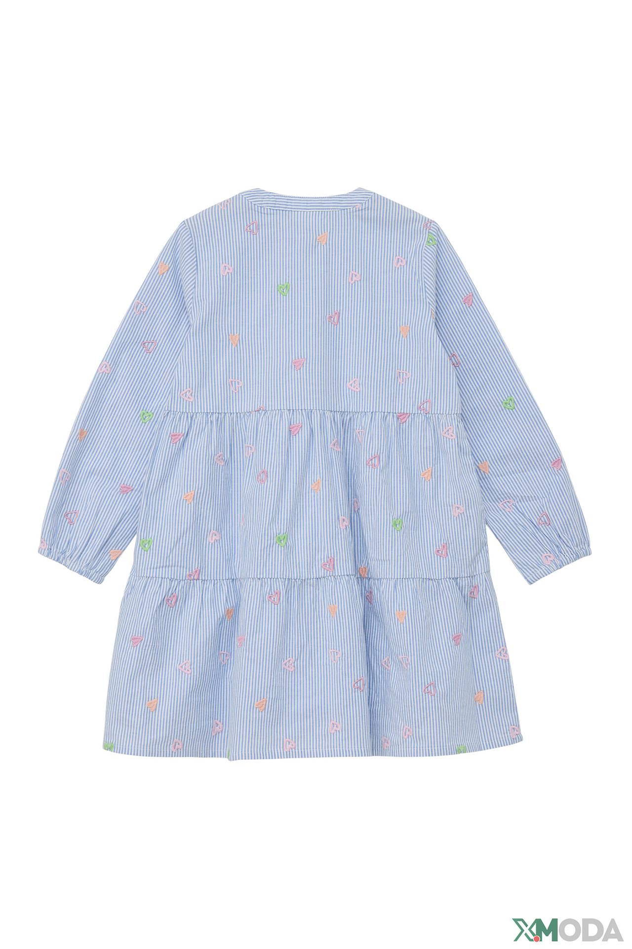 Платье выполнено в классическом стиле с очаровательным дизайном. Голубое платье в полоску украшено вышивкой, придающей изделию игривый вид. Длинные рукава и удобный крой делают его подходящим для различных мероприятий, от повседневных прогулок до праздничных событий.