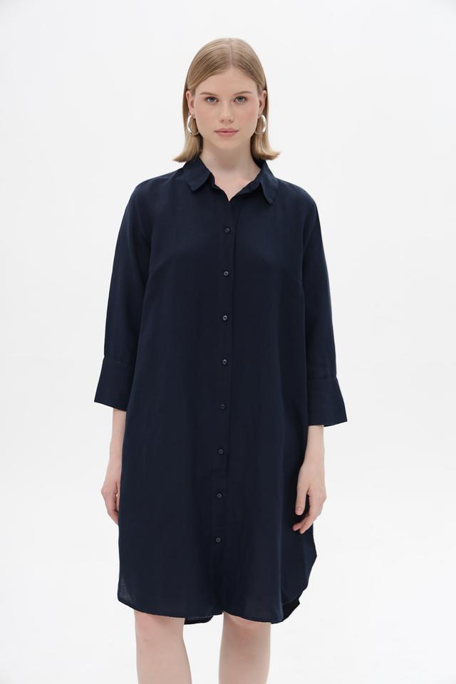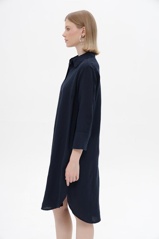 Тёмно-синее платье-рубашка от Tom Tailor выполнено из льна и вискозы. Удобный крой и натуральный состав обеспечивают комфорт в жаркую погоду. Состав: лен 55%, вискоза 45%