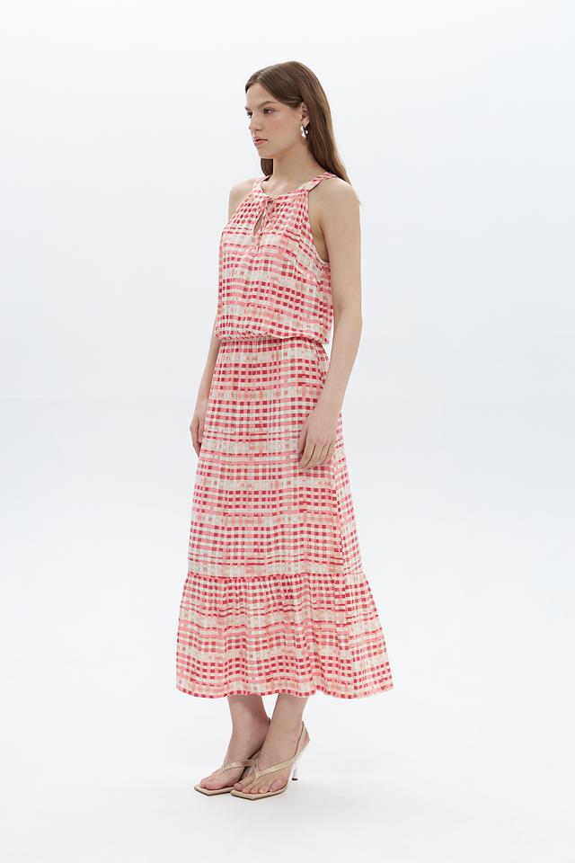 Это летнее платье от Tom Tailor выполнено из 100% вискозы, что делает его приятным к телу и комфортным в жаркую погоду. Платье имеет яркий клетчатый принт в красных и белых тонах, который придаёт ему свежий и летний вид.