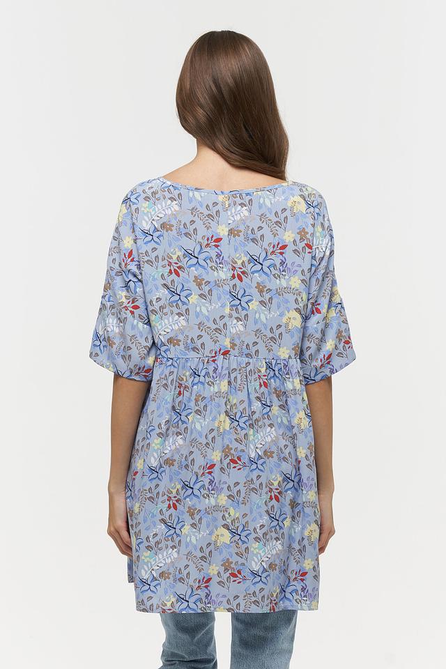 Крой платья свободный, слегка расклешенный к низу, что обеспечивает комфорт и свободу движений. Короткие рукава делают его идеальным для теплой погоды. Вырез горловины округлый, неглубокий.