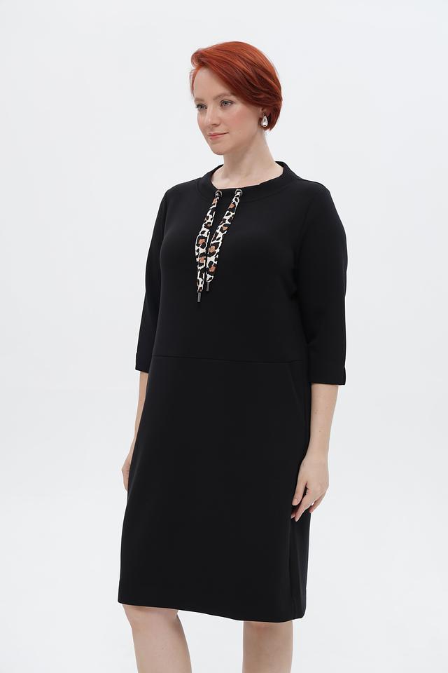 Особенность модели – оригинальный декор в виде вертикальной вставки с леопардовым принтом и декоративными шнурками. Платье имеет рукава длиной три четверти и круглый вырез горловины.