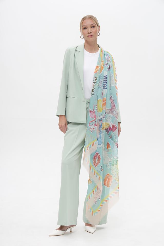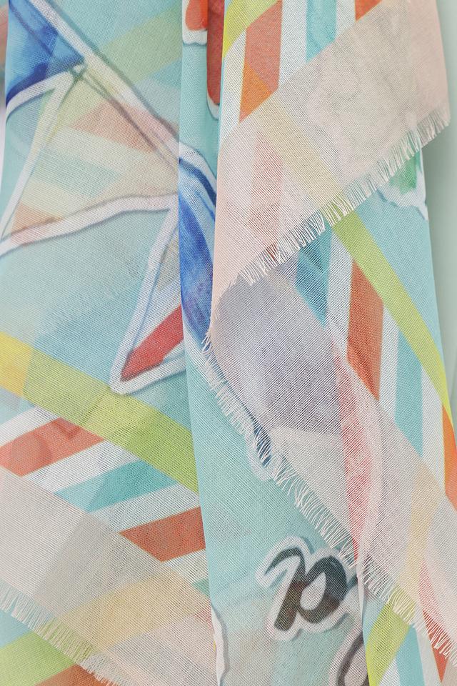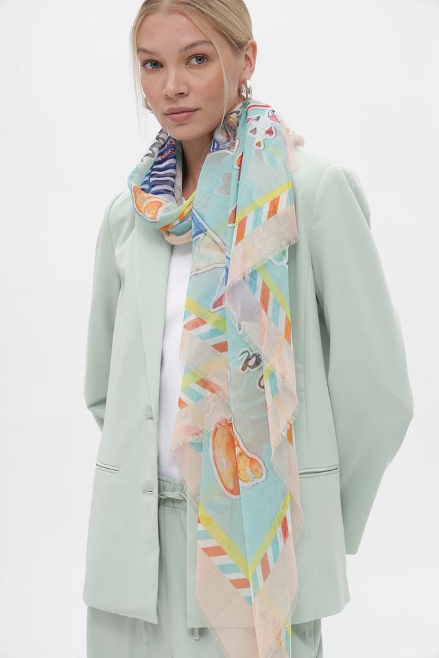 Платок имеет прямоугольную форму и украшен оригинальным принтом, выполненным в голубых, оранжевых, зелёных и розовых тонах. Бахрома по краям добавляет аксессуару изысканности.