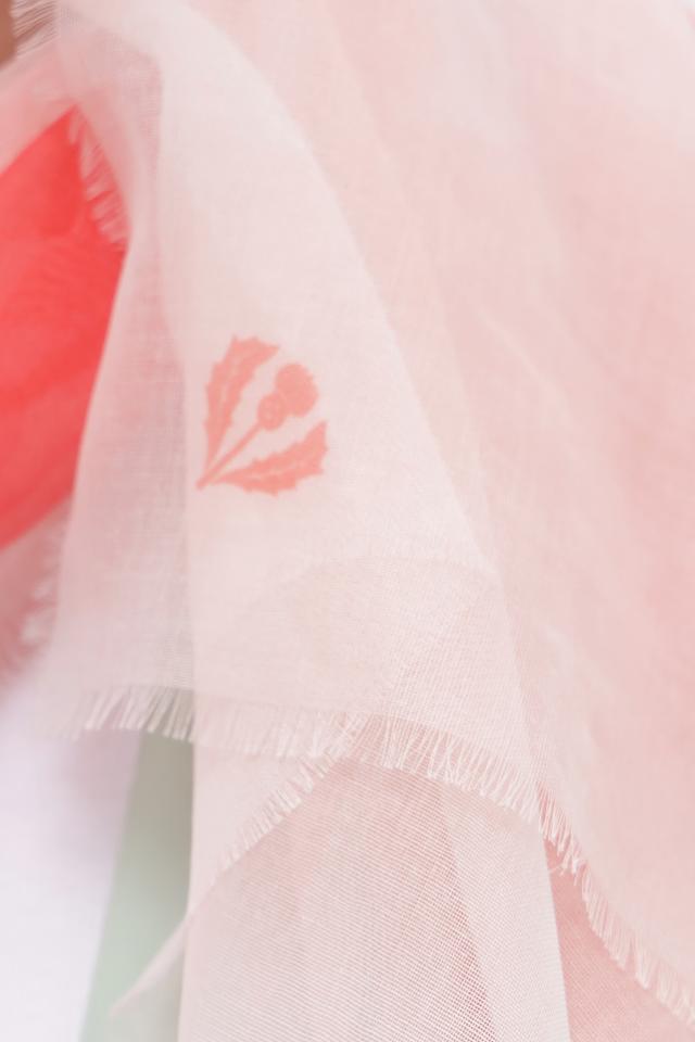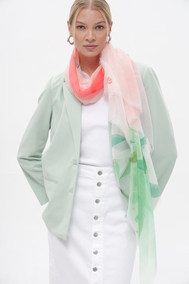 Платок имеет нежный розовый цвет, украшенный цветочным принтом, состоящим из зеленых и розовых оттенков. Полупрозрачная текстура ткани придает изделию легкость и воздушность.