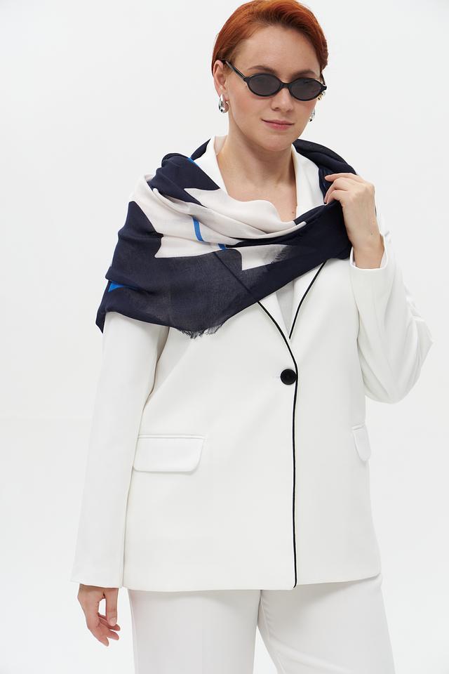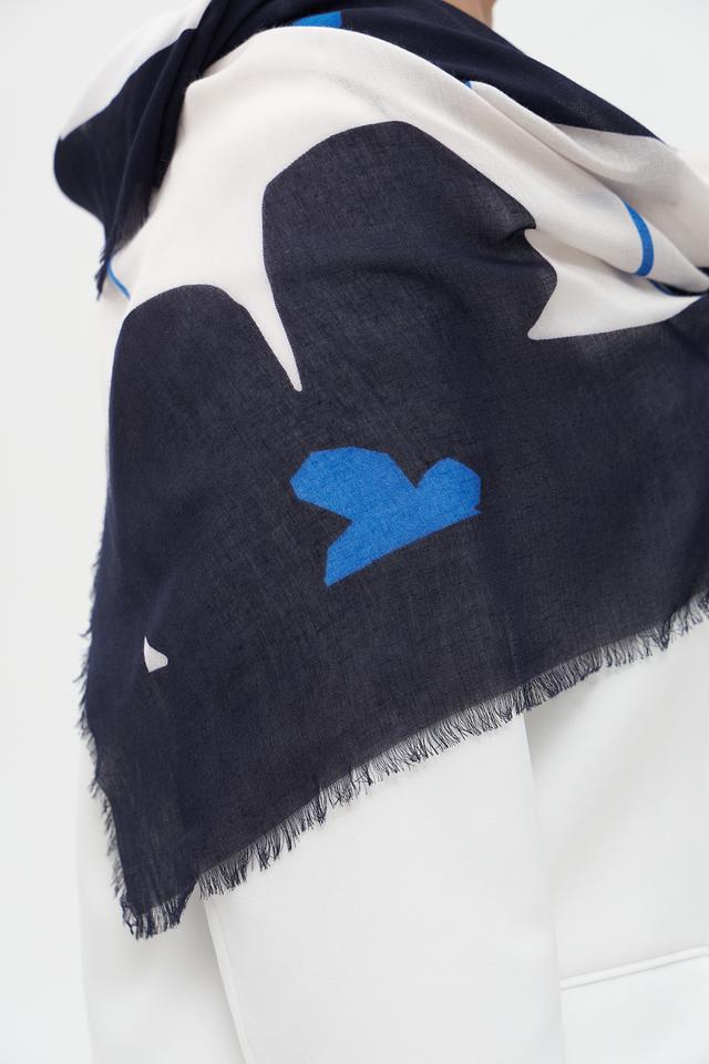 Платок бренда Oui, выполненный в бело-сине-тёмно-синей цветовой гамме, украшен абстрактным цветочным принтом. Изделие из 100% вискозы отличается мягкостью и приятными тактильными ощущениями. Состав: вискоза 100%