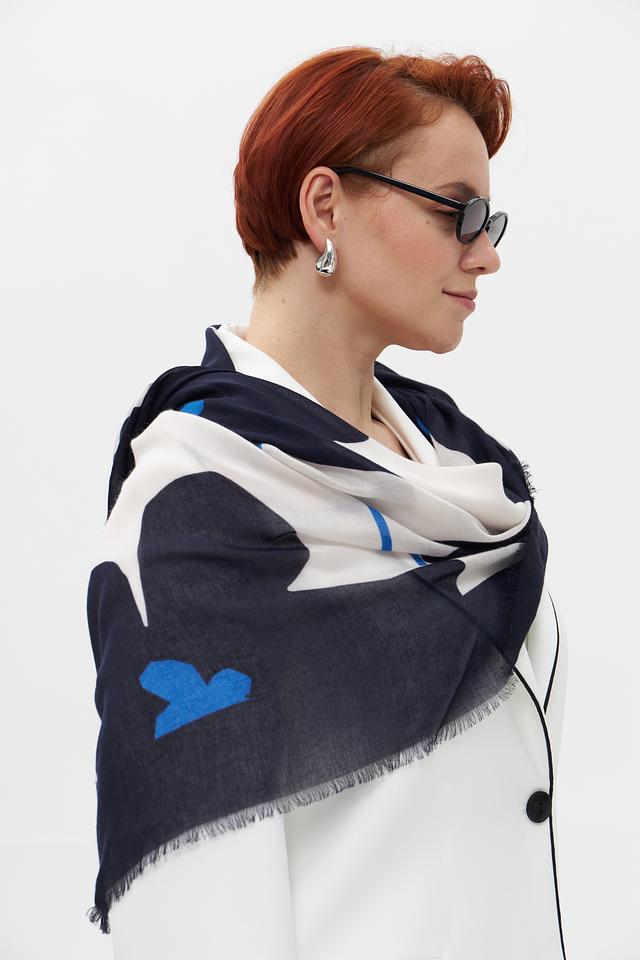 Платок имеет прямоугольную форму и украшен оригинальным цветочным принтом, сочетающим в себе белый, синий и тёмно-синий цвета. Такой рисунок придаёт изделию изысканность и неповторимость.