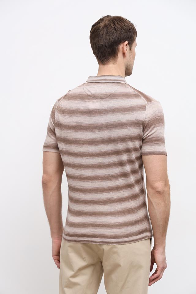 Поло выполнено в бежевом цвете с выразительным полосатым рисунком, который придает образу динамичность и стиль. Воротник выполнен в классической форме. На левой стороне груди расположена небольшая металлическая планка с логотипом бренда.