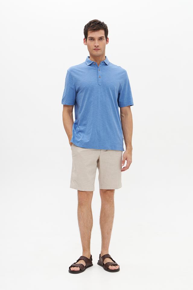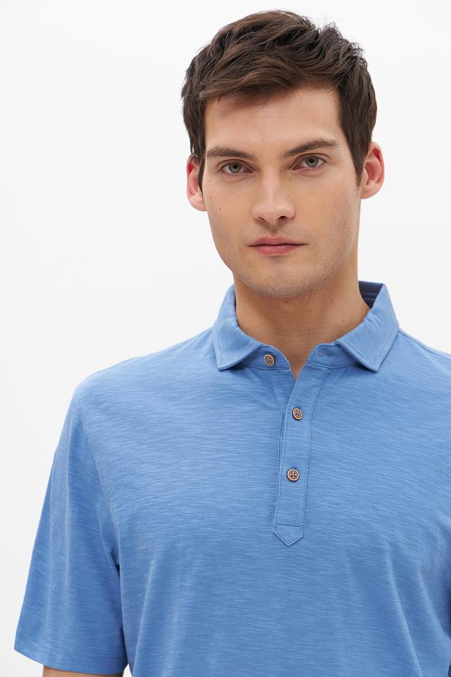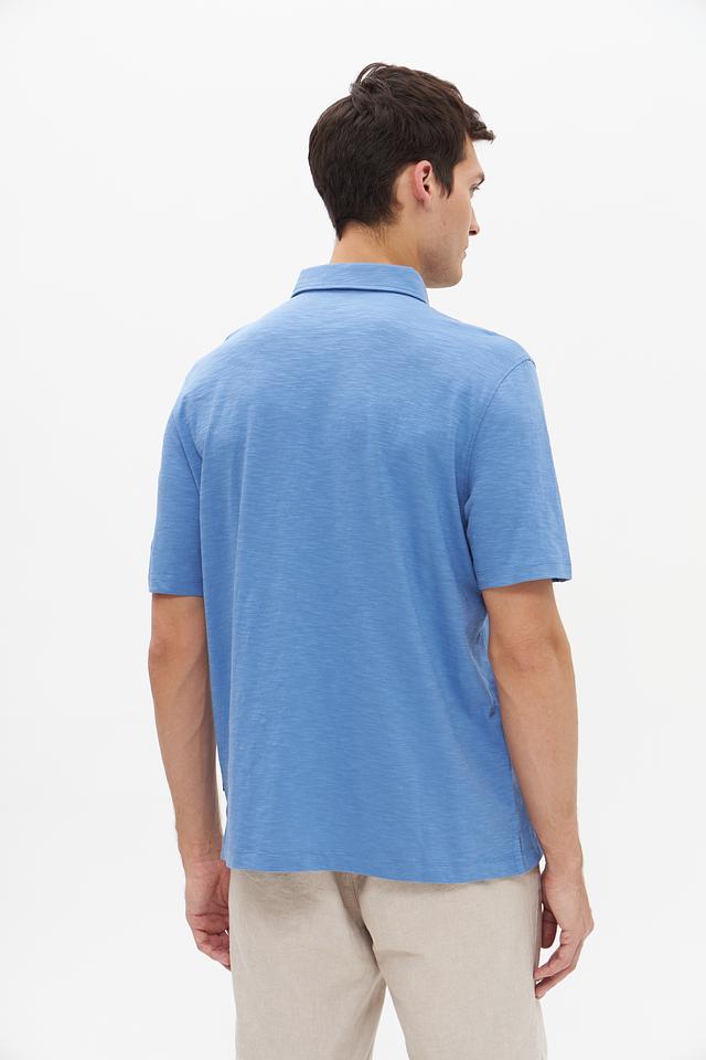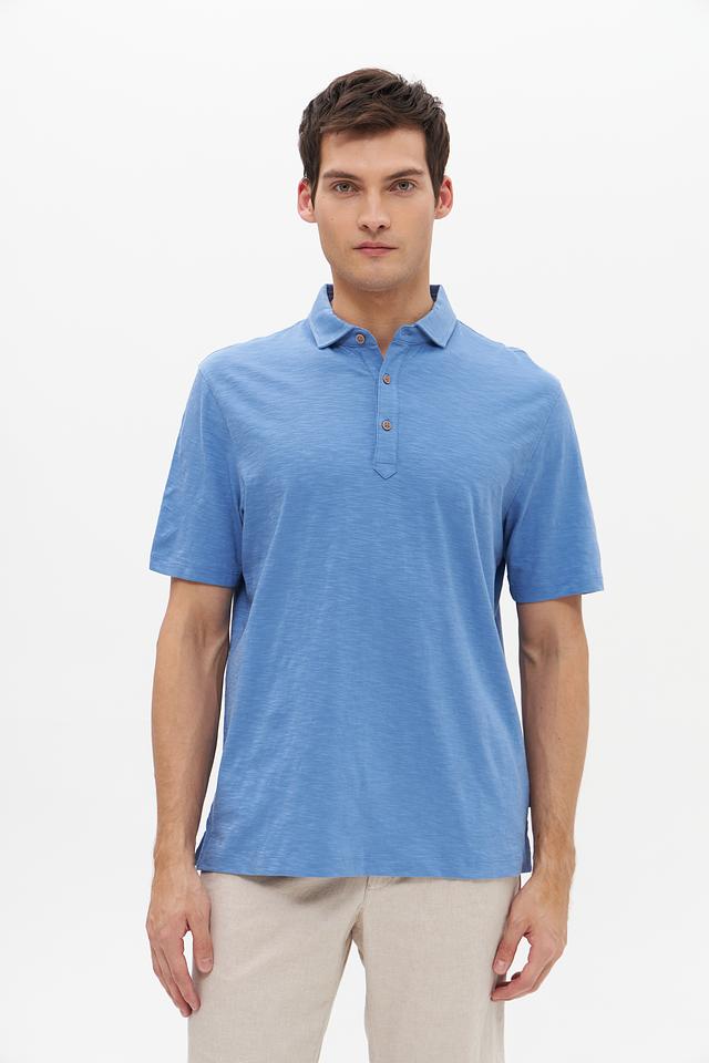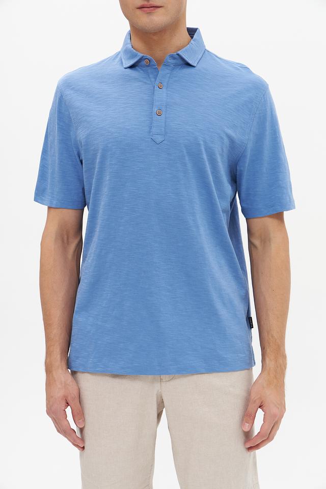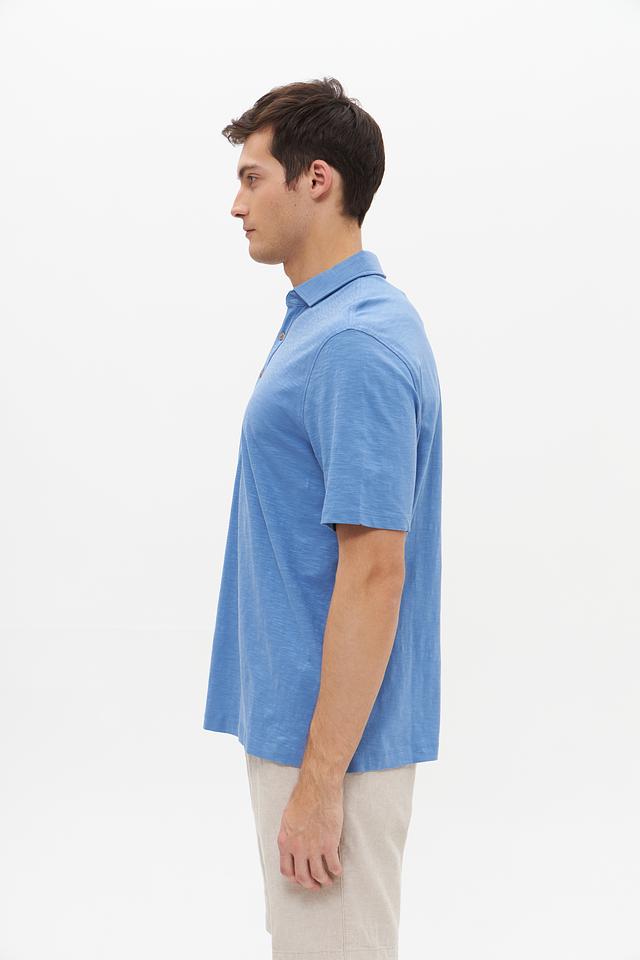 Отличительной особенностью данной модели является её приятная на ощупь текстура и деликатный голубой цвет. Застёжка на три пуговицы обеспечивает удобство надевания и снятия. Поло прекрасно сочетается с шортами, брюками чинос или джинсами, создавая стильный и непринужденный образ.